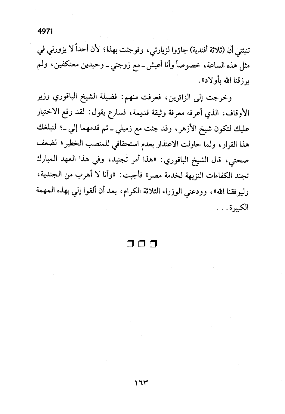 وخرجت إلى الزائرين، فعرفت منهم: فضيلة الشيخ الباقوري وزير الأوقاف، الذي أعرفه معرفة وثيقة قديمة، فسارع يقول: لقد وقع الاختيار عليك لتكون شيخ الأزهر، وقد جئت مع زميلي -ثم قدمهما إلي-؛ لنبلغك هذا القرار، ولما حاولت الاعتذار بعدم استحقاقي للمنصب الخطير؛ لضعف صحتي، قال الشيخ الباقوري: "هذا أمر تجنيد، وفي هذا العهد المبارك تجند الكفاءات النزيهة لخدمة مصر" فأجبت: "وأنا لا أهرب من الجندية، وليوفقنا الله"، وودعني الوزراء الثلاثة الكرام، بعد أن ألقوا إلي بهذه المهمة الكبيرة ...