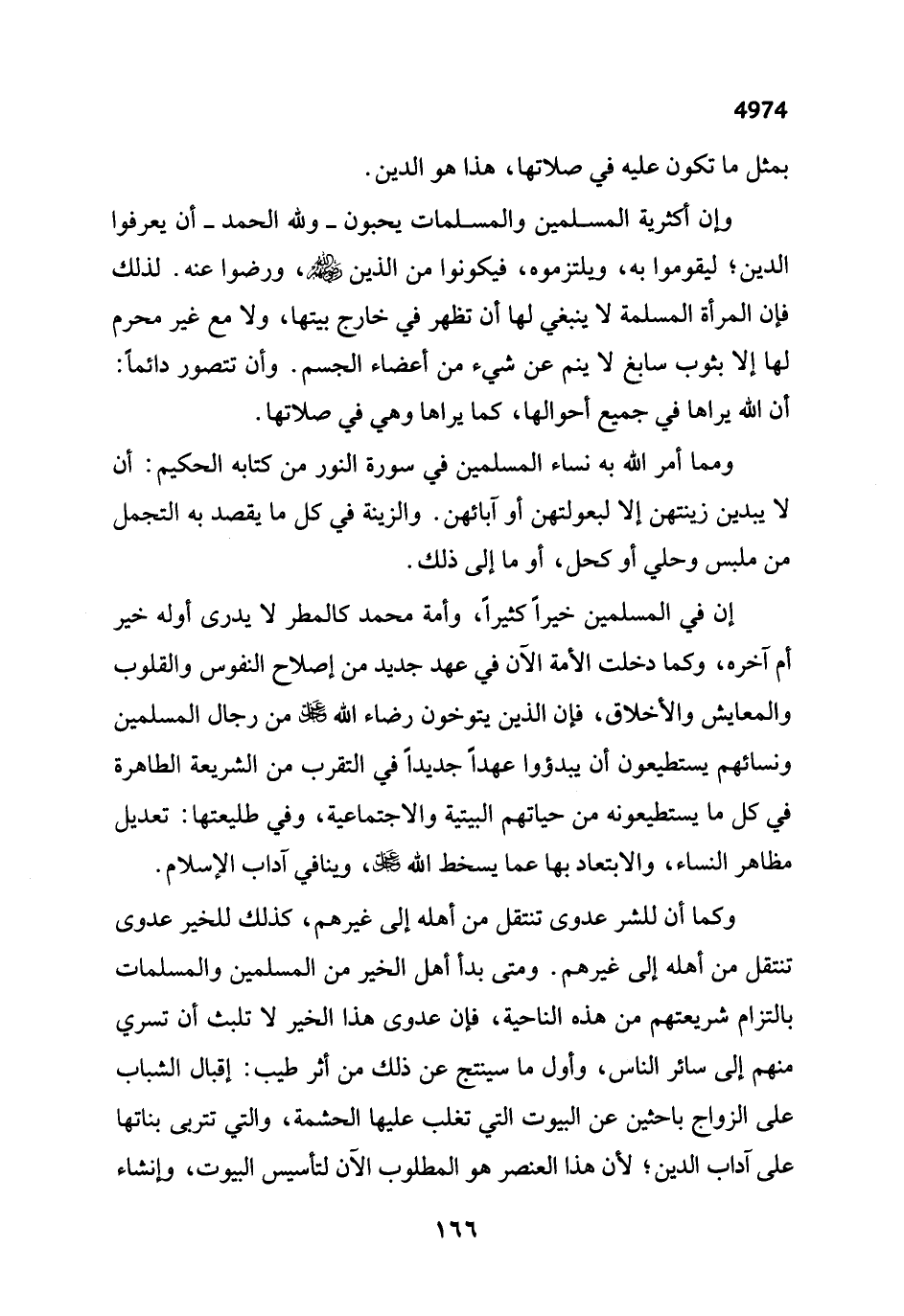 إن في المسلمين خيراً كثيراً، وأمة محمد كالمطر لا يدرى أوله خير أم آخره، وكما فى خلت الأمة الآن في عهد جديد من إصلاح النفوس والقلوب والمعايش والأخلاق، فإن الذين يتوخون رضاء الله -عَزَّ وَجَلَّ- من رجال المسلمين ونسائهم يستطيعون أن يبدؤوا عهداً جديدأ في التقرب من الشريعة الطاهرة في كل ما يستطيعونه من حياتهم البيتية والاجتماعية، وفي طليعتها: تعديل مظاهر النساء، والابتعاد بها عما يسخط الله -عَزَّ وَجَلَّ-، وينافي آداب الإسلام.