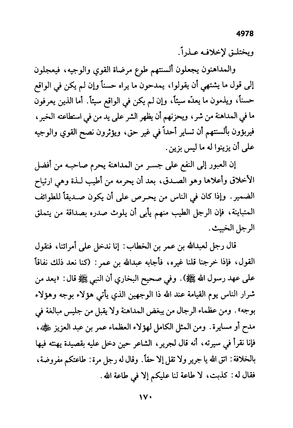قال رجل لعبد الله بن عمر بن الخطاب: إنا ندخل على أمرائنا، فنقول القول، فإذا خرجنا قلنا غيره، فأجابه عبد الله بن عمر: (كنا نعد ذلك نفاقاً على عهد رسول الله - صلى الله عليه وسلم -). وفي صحيح البخاري أن النبي - صلى الله عليه وسلم - قال: "يعد من شرار الناس يوم القيامة عند الله ذا الوجهين الذي يأتي هؤلاء بوجه وهؤلاء بوجه). ومن عظماء الرجال من يبغض المداهنة ولا يقبل من جليس مبالغة في مدح أو مسايرة. ومن المثل الكامل لهؤلاء العظماء عمر بن عبد العزيز - رضي الله عنه -، فإنا نقرأ في سيرته، أنه قال لجرير، الشاعر حين دخل عليه بقصيدة يهنئه فيها بالخلافة: اتق الله يا جرير ولا تقل إلا حقاً. وقال له رجل مرة: طاعتكم مفروضة، فقال له: كذبت، لا طاعة لنا عليكم إلا في طاعة الله.