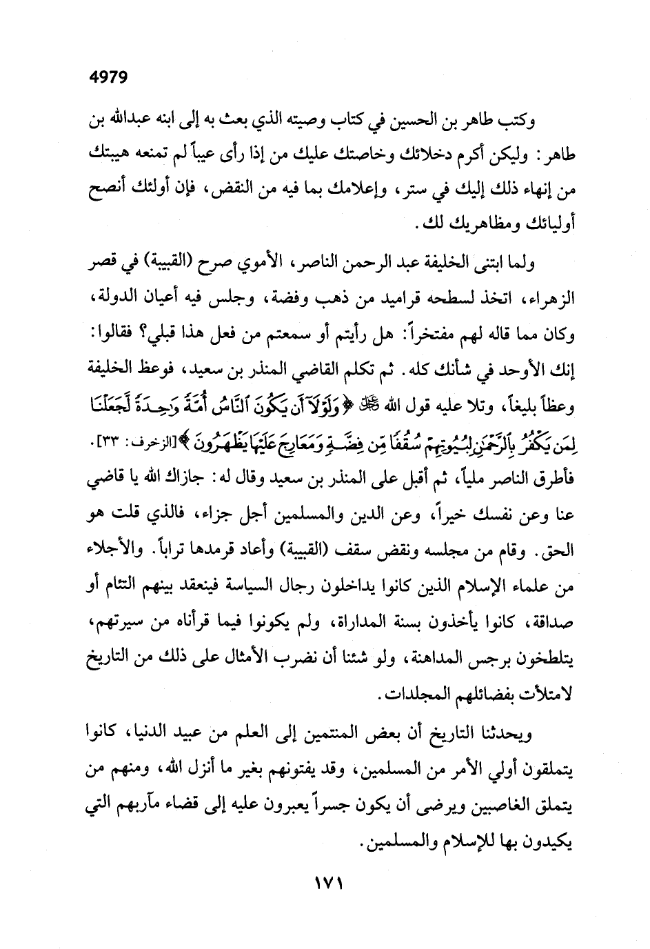 ولما ابتنى الخليفة عبد الرحمن الناصر، الأموي صرح (القبيبة) في قصر الزهراء، اتخذ لسطحه قراميد من ذهب وفضة، وجلس فيه أعيان الدولة، وكان مما قاله لهم مفتخراً: هل رأيتم أو سمعتم من فعل هذا قبلي؟ فقالوا: إنك الأوحد في شأنك كله. ثم تكلم القاضي المنذر بن سعيد، فوعظ الخليفة وعظأ بليغاً، وتلا عليه قول الله -عَزَّ وَجَلَّ- {وَلَوْلَا أَنْ يَكُونَ النَّاسُ أُمَّةً وَاحِدَةً لَجَعَلْنَا لِمَنْ يَكْفُرُ بِالرَّحْمَنِ لِبُيُوتِهِمْ سُقُفًا مِنْ فِضَّةٍ وَمَعَارِجَ عَلَيْهَا يَظْهَرُونَ} [الزخرف: 33]. فأطرق الناصر ملياً، ثم أقبل على المنذر بن سعيد وقال له: جازاك الله يا قاضي عنا وعن نفسك خيراً، وعن الدين والمسلمين أجل جزاء، فالذي قلت هو الحق. وقام من مجلسه ونقض سقف (القبيبة) وأعاد قرمدها تراباً. والأجلاء من علماء الإسلام الذين كانوا يداخلون رجال السياسة فينعقد بينهم التئام أو صداقة، كانوا يأخذون بسنة المداراة، ولم يكونوا فيما قرأناه من سيرتهم، يتلطخون برجس المداهنة، ولو شئنا أن نضرب الأمثال على ذلك من التاريخ لامتلأت بفضائلهم المجلدات.