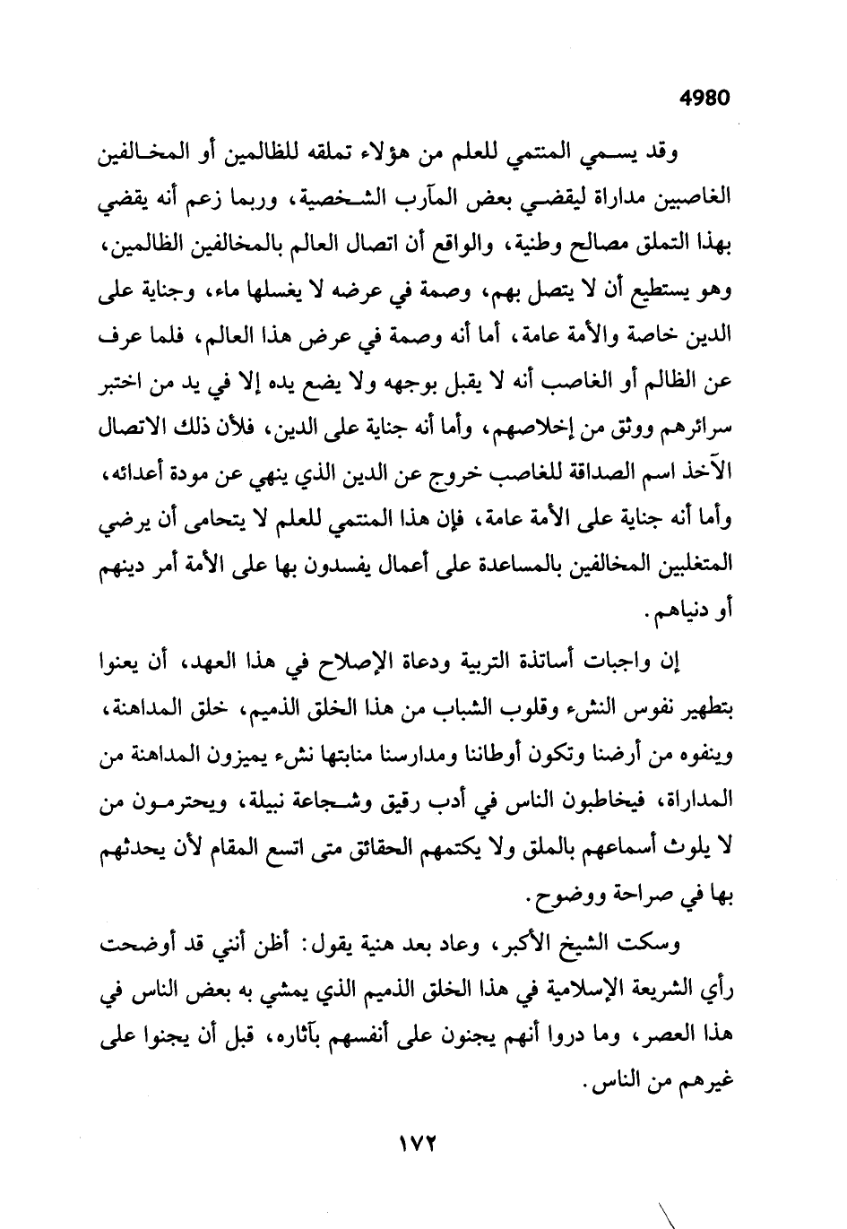 وسكت الشيخ الأكبر، وعاد بعد هنية يقول: أظن أنني قد أوضحت رأي الشريعة الإسلامية في هذا الخلق الذميم الذي يمشي به بعض الناس في هذا العصر، وما دروا أنهم يجنون على أنفسهم بآثاره، قبل أن يجنوا على غيرهم من الناس.