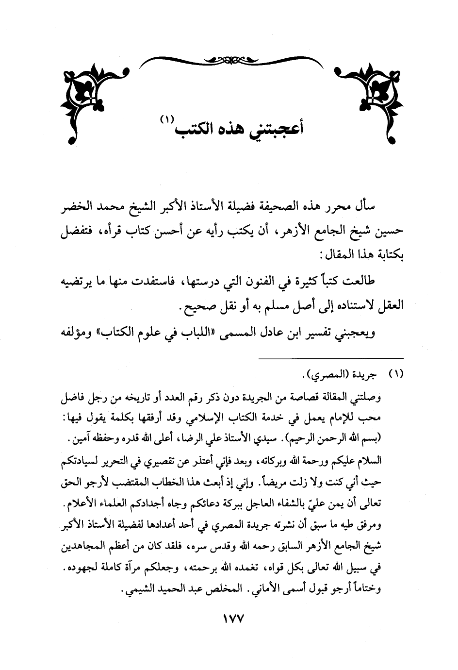 سأل محرر هذه الصحيفة فضيلة الأستاذ الأكبر الشيخ محمد الخضر حسين شيخ الجامع الأزهر، أن يكتب رأيه عن أحسن كتاب قرأه، فتفضل بكتابة هذا المقال: