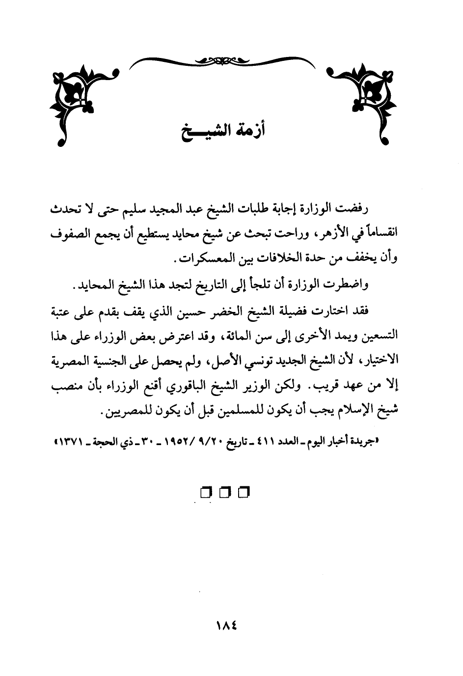 فقد اختارت فضيلة الشيخ الخضر حسين الذي يقف بقدم على عتبة التسعين ويمد الأخرى إلى سن المائة، وقد اعترض بعض الوزراء على هذا الاختيار، لأن الشيخ الجديد تونسي الأصل، ولم يحصل على الجنسية المصرية إلا من عهد قريب. ولكن الوزير الشيخ الباقوري أقنع الوزراء بأن منصب شيخ الإسلام يجب أن يكون للمسلمين قبل أن يكون للمصريين.