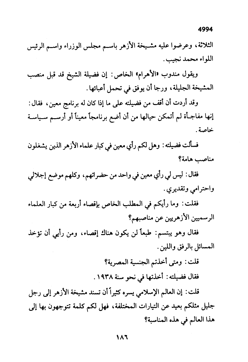 فقلت: وما رأيكم في المطلب الخاص بإقصاء أربعة من كبار العلماء الرسميين الأزهريين عن مناصبهم؟