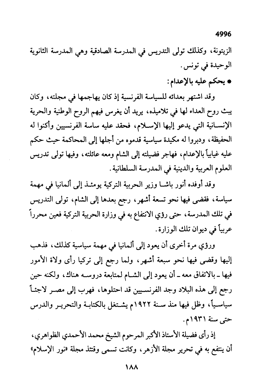 وقد اشتهر بعدائه للسياسة الفرنسية إذ كان يهاجمها في مجلته، وكان يبث روح العداء لها في تلاميذه، يريد أن يغرس فيهم الروح الوطنية والحرية الإنسانية التي يدعو إليها الإسلام، فحقد عليه ساسة الفرنسيين وأكنوا له الحفيظة، ودبروا له مكيدة سياسية قدموه من أجلها إلى المحاكمة حيث حكم عليه غيابياً بالإعدام، فهاجر فضيلته إلى الشام ومعه عائلته، وفيها تولى تدريس العلوم العربية والدينية في المدرسة السلطانية.
