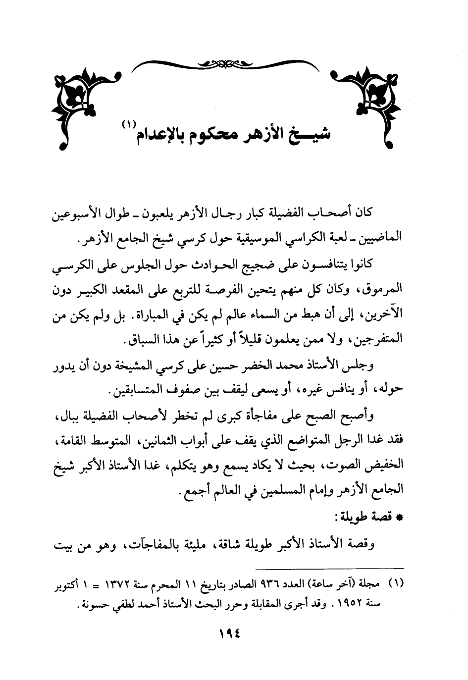(¬1) مجلة (آخر ساعة) العدد 936 الصادر بتاريخ 11 المحرم سنة 1372= 1 أكتوبر سنة 1952. وقد أجرى المقابلة وحرر البحث الأستاذ أحمد لطفي حسونة.