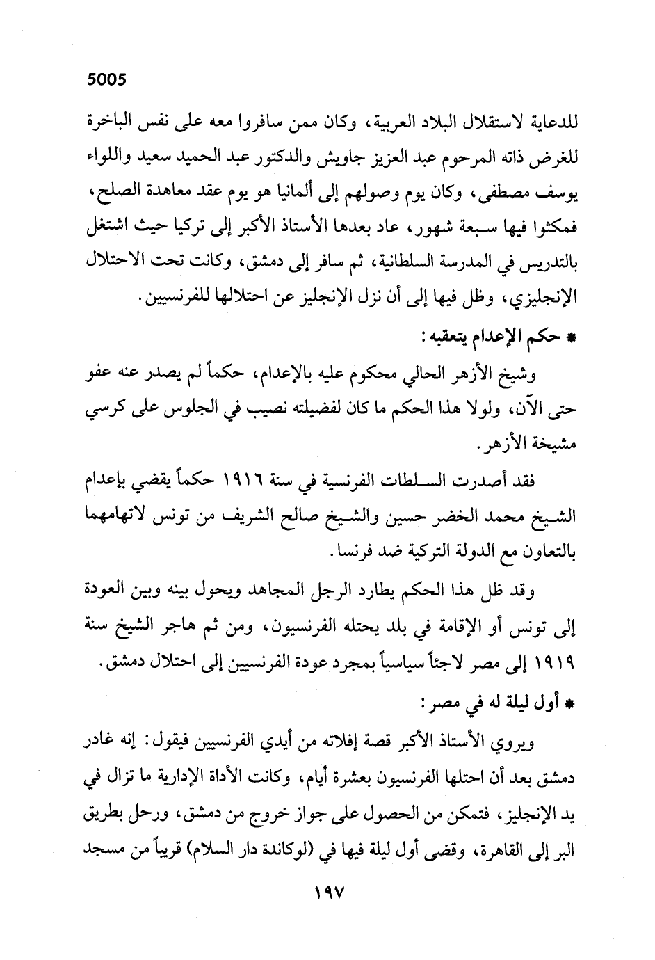 ويروي الأستاذ الأكبر قصة إفلاته من أيدي الفرنسيين فيقول: إنه غادر دمشق بعد أن احتلها الفرنسيون بعشرة أيام، وكانت الأداة الإدارية ما تزال في يد الإنجليز، فتمكن من الحصول على جواز خروج من دمشق، ورحل بطريق البر إلى القاهرة، وقضى أول ليلة فيها في (لوكاندة دار السلام) قريباً من مسجد