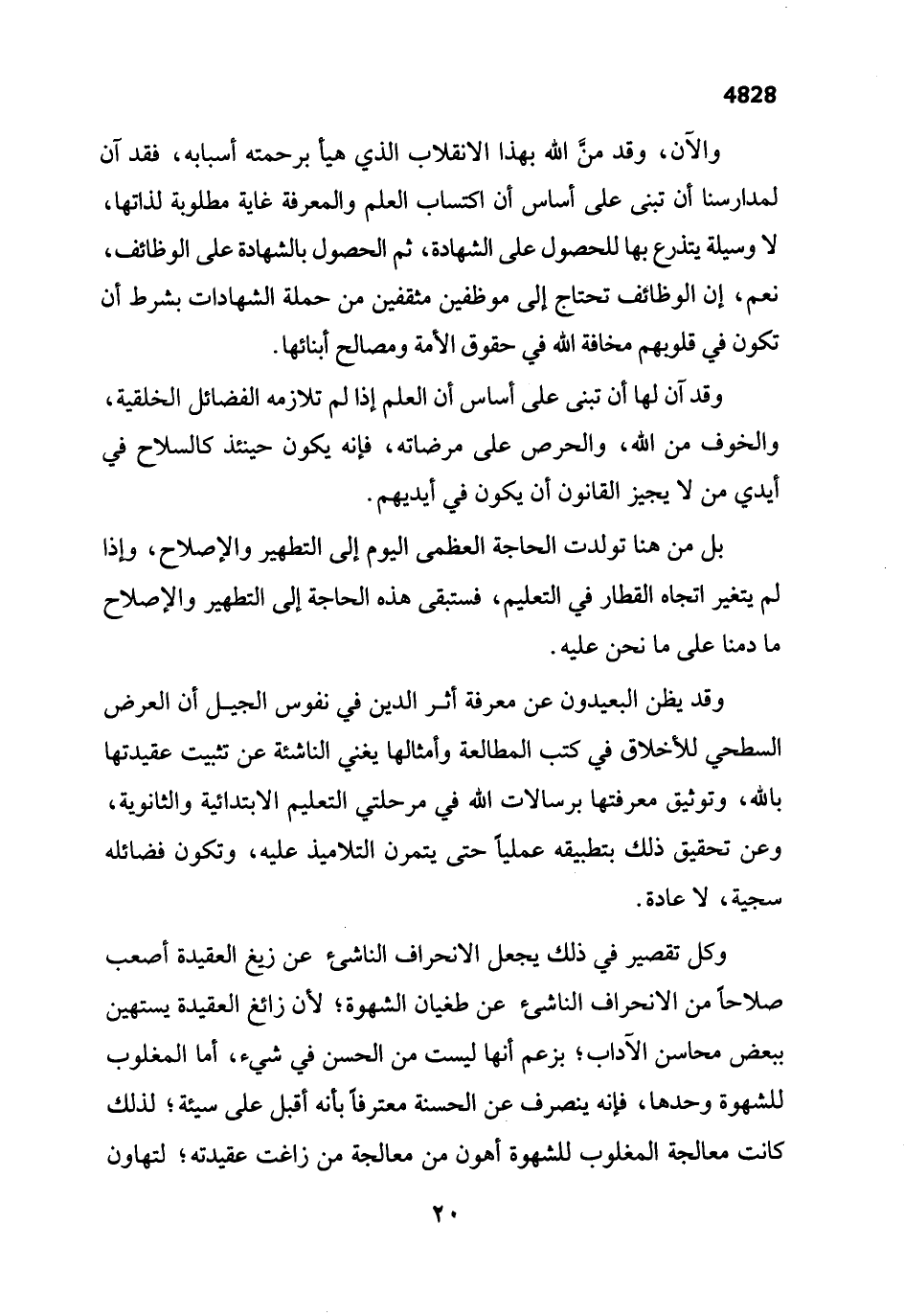 والآن، وقد منَّ الله بهذا الانقلاب الذي هيأ برحمته أسبابه، فقد آن لمدارسنا أن تبنى على أساس أن اكتساب العلم والمعرفة غاية مطلوبة لذاتها، لا وسيلة يتذرع بها للحصول على الشهادة، ثم الحصول بالشهادة على الوظائف، نعم، إن الوظائف تحتاج إلى موظفين مثقفين من حملة الشهادات بشرط أن تكون في قلويهم مخافة الله في حقوق الأمة ومصالح أبنائها.