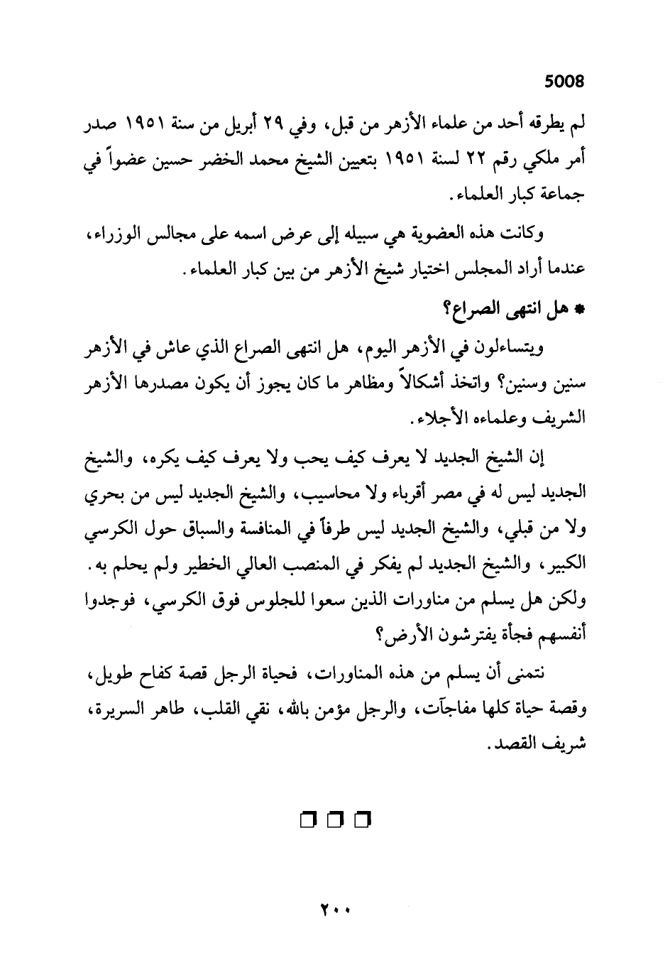 ويتساءلون في الأزهر اليوم، هل انتهى الصراع الذي عاش في الأزهر سنين وسنين؟ واتخذ أشكالاً ومظاهر ما كان يجوز أن يكون مصدرها الأزهر الشريف وعلماءه الأجلاء.
