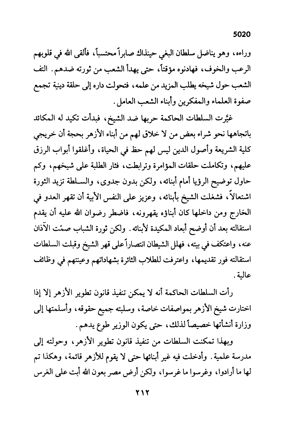 وبهذا تمكنت السلطات من تنفيذ قانون تطوير الأزهر، وحولته إلى مدرسة علمية. وأدخلت فيه غير أبنائها حتى لا يقوم للأزهر قائمة، وهكذا تم لها ما أرادوا، وغرسوا ما غرسوا، ولكن أرض مصر بعون الله أبت على الغرس