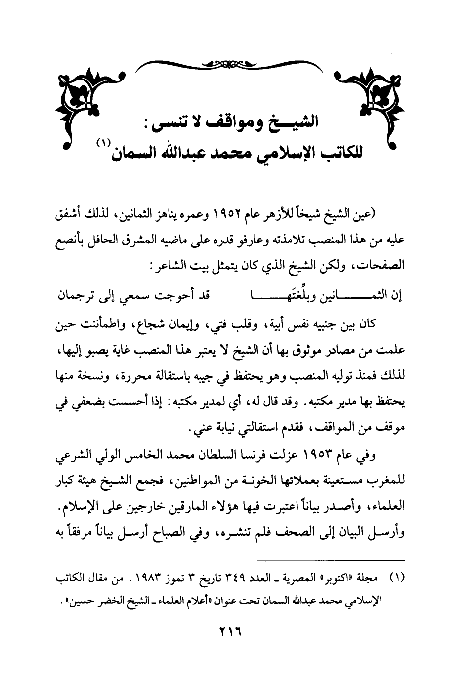(¬1) مجلة "اكتوبر" المصرية - العدد 349 تاريخ 3 تموز 1983. من مقال الكاتب الإسلامي محمد عبد الله السمان تحت عنوان "أعلام العلماء - الشيخ الخضر حسين".