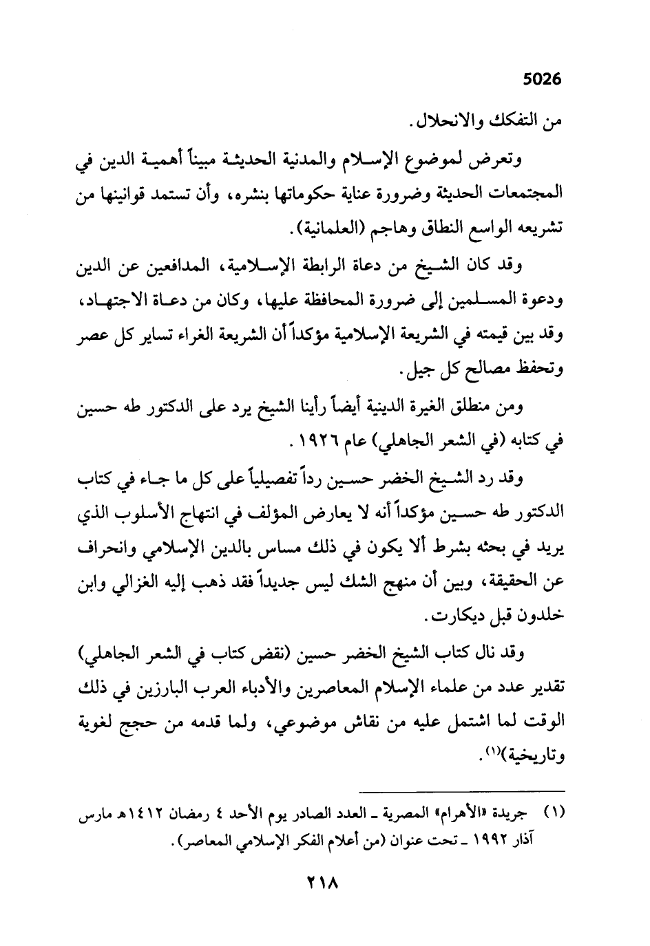 (¬1) جريدة "الأهرام" المصرية - العدد الصادر يوم الأحد 4 رمضان 1412 هـ مارس آذار 1992 - تحت عنوان (من أعلام الفكر الإسلامي المعاصر).