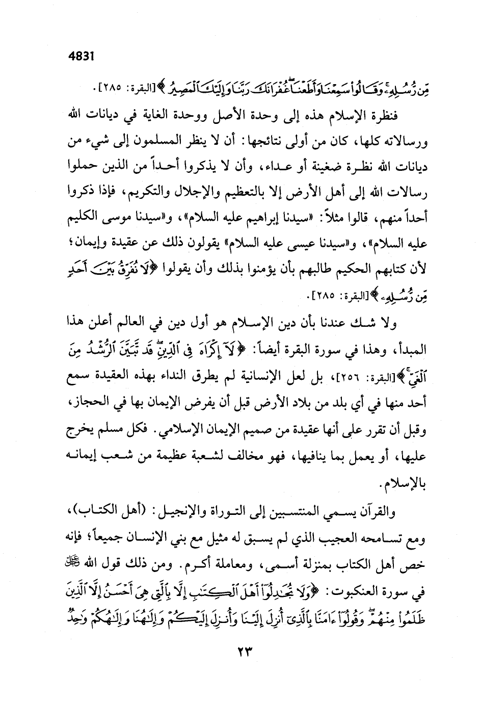 ولا شك عندنا بأن دين الإسلام هو أول دين في العالم أعلن هذا المبدأ، وهذا في سورة البقرة أيضاً: {لَا إِكْرَاهَ فِي الدِّينِ قَدْ تَبَيَّنَ الرُّشْدُ منَ الغَىِّ} [البقرة: 256] , بل لعل الإنسانية لم يطرق النداء بهذه العقيدة سمع أحد منها في أي بلد من بلاد الأرض قبل أن يفرض الإيمان بها في الحجاز، وقبل أن تقرر على أنها عقيدة من صميم الإيمان الإسلامي. فكل مسلم يخرج عليها، أويعمل بما ينافيها، فهو مخالف لشعبة عظيمة من شعب إيمانه بالإسلام.