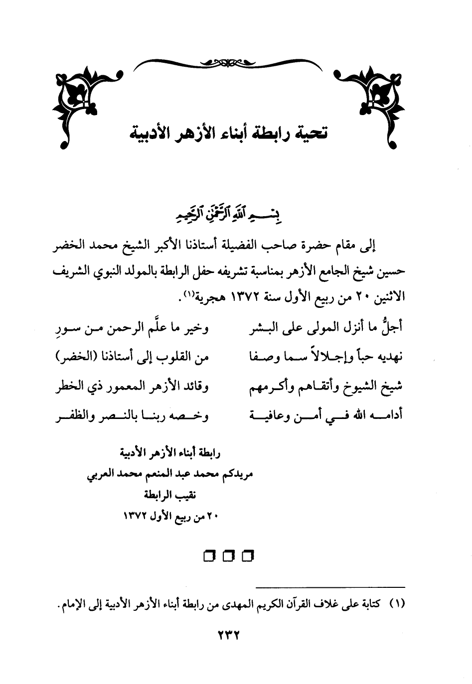 إلى مقام حضرة صاحب الفضيلة أستاذنا اكبر الشيخ محمد الخضر حسين شيخ الجامع الأزهر بمناسبة تشريفه حفل الرابطة بالمولد النبوي الشريف الاثنين 20 من ربيع الأول سنة 1372 هجرية (¬1).