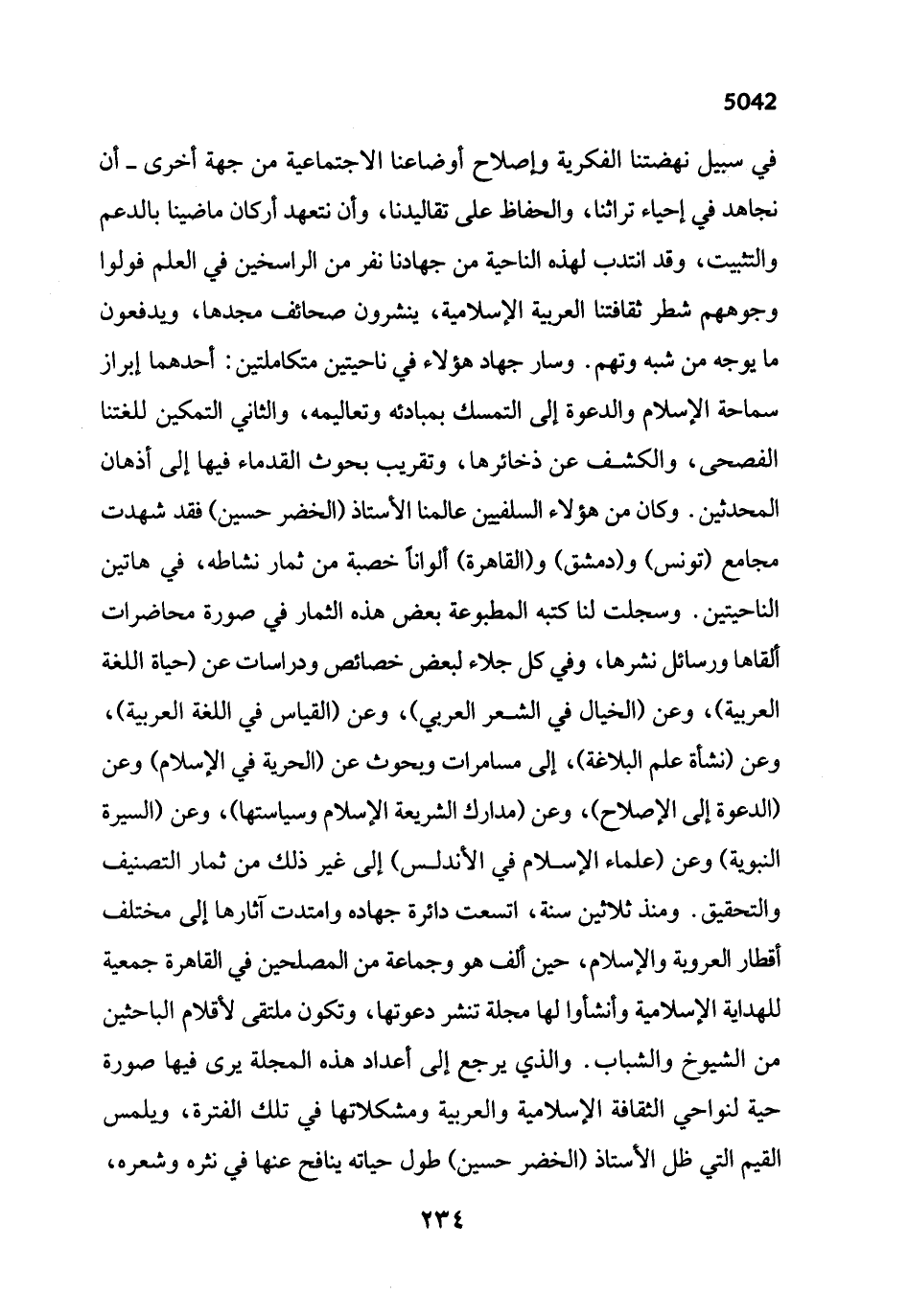 في سييل نهضتنا الفكرية وإصلاح أوضاعنا الاجتماعية من جهة أخرى - أن نجاهد في إحياء تراثنا، والضاظ على تقاليدنا، وأن نتعهد أركان ماضينا بالدعم والتثبيت، وقد انتدب لهذه الناحية من جهادنا نفر من الراسخين في العلم فولوا وجوههم شطر ثقافتنا العربية الإسلامية، ينشرون صحائف مجدها، ويدفعون ما يوجه من شبه وتهم. وسار جهاد هؤلاء في ناحيتين متكاملتين: أحدهما إبراز سماحة الإسلام والدعوة إلى التمسك بمبادئه وتعاليمه، والثاني التمكين للغتنا الفصحى، والكشف عن ذخائرها، وتقريب بحوث القدماء فيها إلى أذهان المحدثين. وكان من هؤلاء السلفيين عالمنا الأستاذ (الضر حسين) فقد شهدت مجامع (تونس) و (دمشق) و (القاهرة) ألواناً خصبة من ثمار نشاطه، في هاتين الناحيتين. وسجلت لنا كتبه المطبوعة بعض هذه الثمار في صورة محاضرات ألقاها ورسائل نشرها، وفي كل جلاء لبعض خصائص ودراسات عن (حياة اللغة العربية)، وعن (الخيال في الشعر العربي)، وعن (القياس في اللغة العربية)، وعن (نشأة علم البلاغة)، إلى مسامرات ويحوث عن (الحرية في الإسلام) وعن (الدعوة إلى الإصلاح)، وعن (مدارك الشريعة الإسلام وسياستها)، وعن (السيرة النبوية) وعن (علماء الإسلام في الأندلس) إلى غير ذلك من ثمار التصنيف والتحقيق. ومنذ ثلاثين سنة، اتسعت دائرة جهاده وامتدت آثارها إلى مختلف أقطار العروية والإسلام، حين ألف هو وجماعة من المصلحين في القاهرة جمعية للهداية الإسلامية وأنشأوا لها مجلة تنشر دعوتها، وتكون ملتقى لأقلام الباحثين من الشيوخ والشباب. والذي يرجع إلى أعداد هذه المجلة يرى فيها صورة حية لنواحي الثقافة الإسلامية والعربية ومشكلاتها في تلك الفترة، ويلمس القيم التي ظل الأستاذ (الخضر حسين) طول حياته ينافح عنها في نثره وشعره،