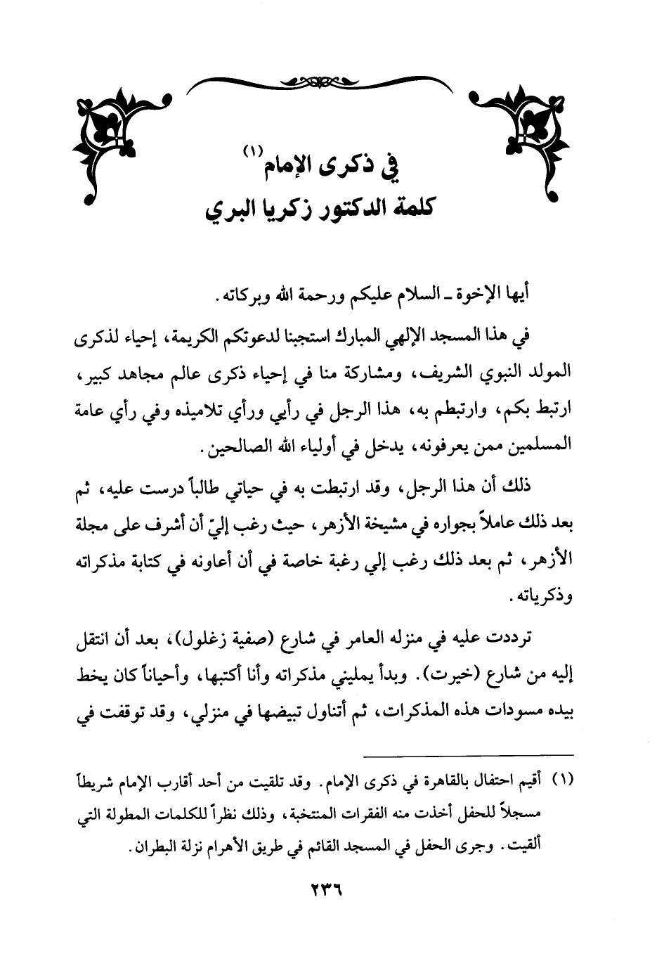 (¬1) أقيم احتفال بالقاهرة في ذكرى الإمام. وقد تلقيت من أحد أقارب الإمام شريطاً مسجلاً للحفل أخذت منه الفقرات المنتخبة، وذلك نظراً للكلمات المطولة التي ألقيت. وجرى الحفل في المسجد القائم في طريق الأهرام نزلة البطران.