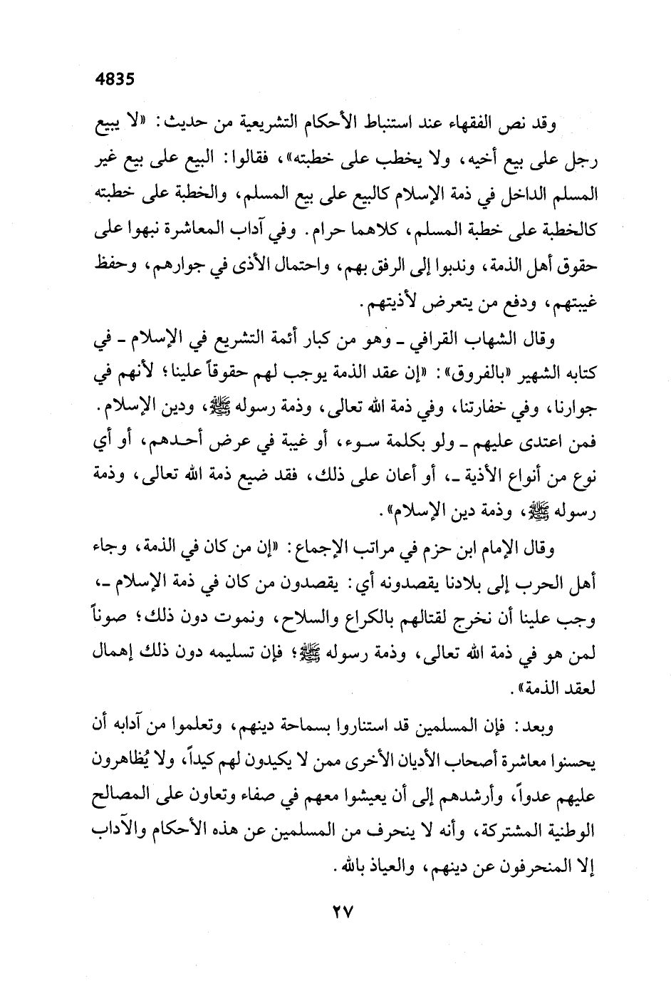 وقال الشهاب القرافي -وهو من كبار أئمة التشريع في الإسلام- في كتابه الشهير "بالفروق": "إن عقد الذمة يوجب لهم حقوقاً علينا؛ لأنهم في جوارنا، وفي خفارتنا، وفي ذمةالله تعالى، وذمة رسوله - صلى الله عليه وسلم -، ودين الإسلام. فمن اعتدى عليهم -ولو بكلمة سوء، أو غيبة في عرض أحدهم، أو أي نوع من أنواع الأذية-، أو أعان على ذلك، فقد ضيع ذمة الله تعالى، وذمة رسوله - صلى الله عليه وسلم -، وذمة دين الإسلام".