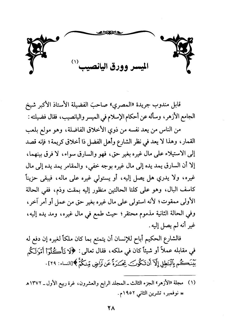 قابل مندوب جريدة "المصري" صاحبَ الفضيلة الأستاذ الأكبر شيخ الجامع الأزهر، وسأله عن أحكام الإسلام في الميسر واليانصيب، فقال فضيلته: