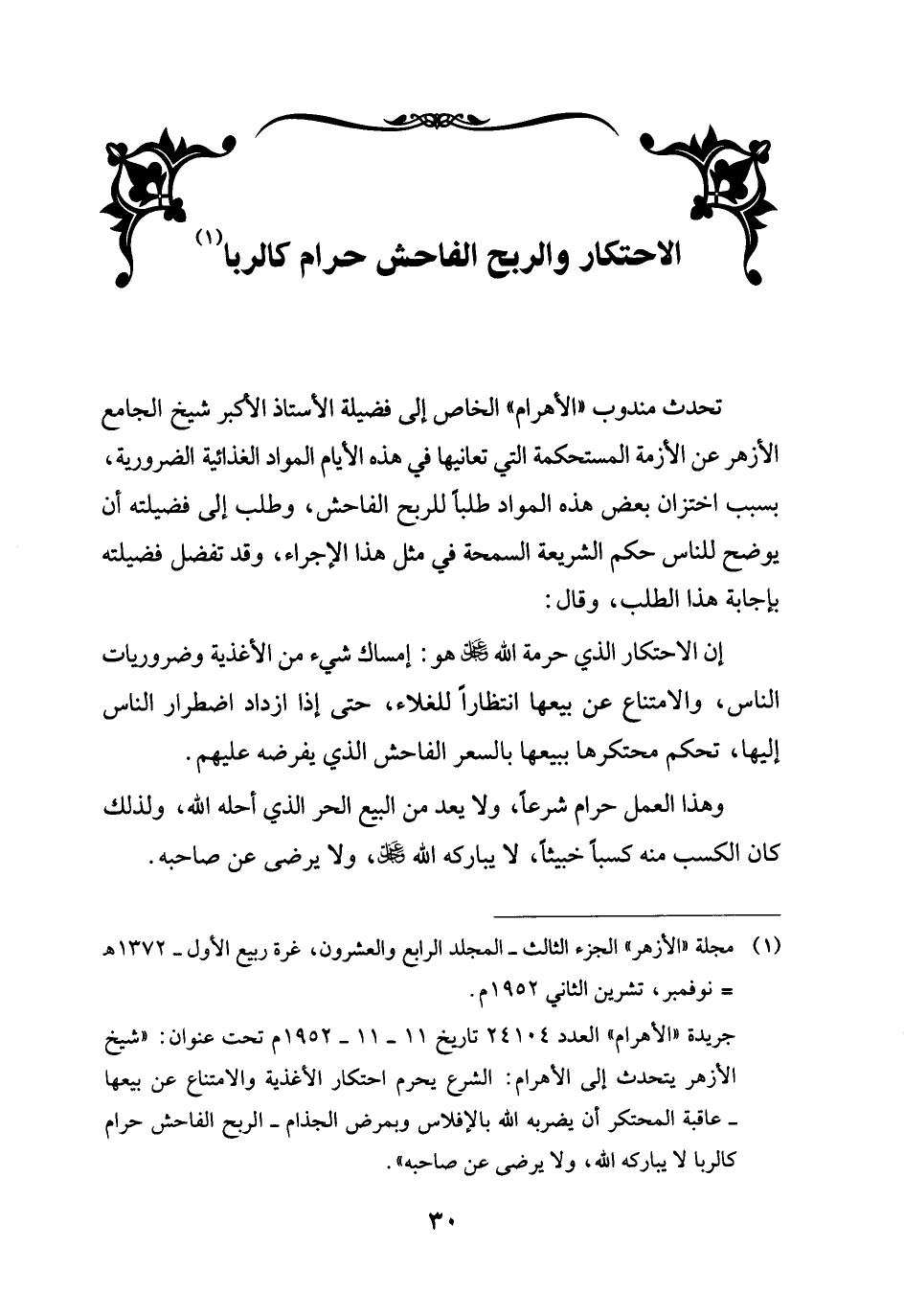 جريدة "الأهرام" العدد 24104 تاريخ 11 - 11 - 1952 م تحت عنوان: "شيخ الأزهر يتحدث إلى الأهرام: الشرع يحرم احتكار الأغذية والامتناع عن بيعها -عاقبة المحتكر أن يضربه الله بالإفلاس وبمرض الجذام- الربح الفاحش حرام كالربا لا يباركه الله، ولا يرضى عن صاحبه".
