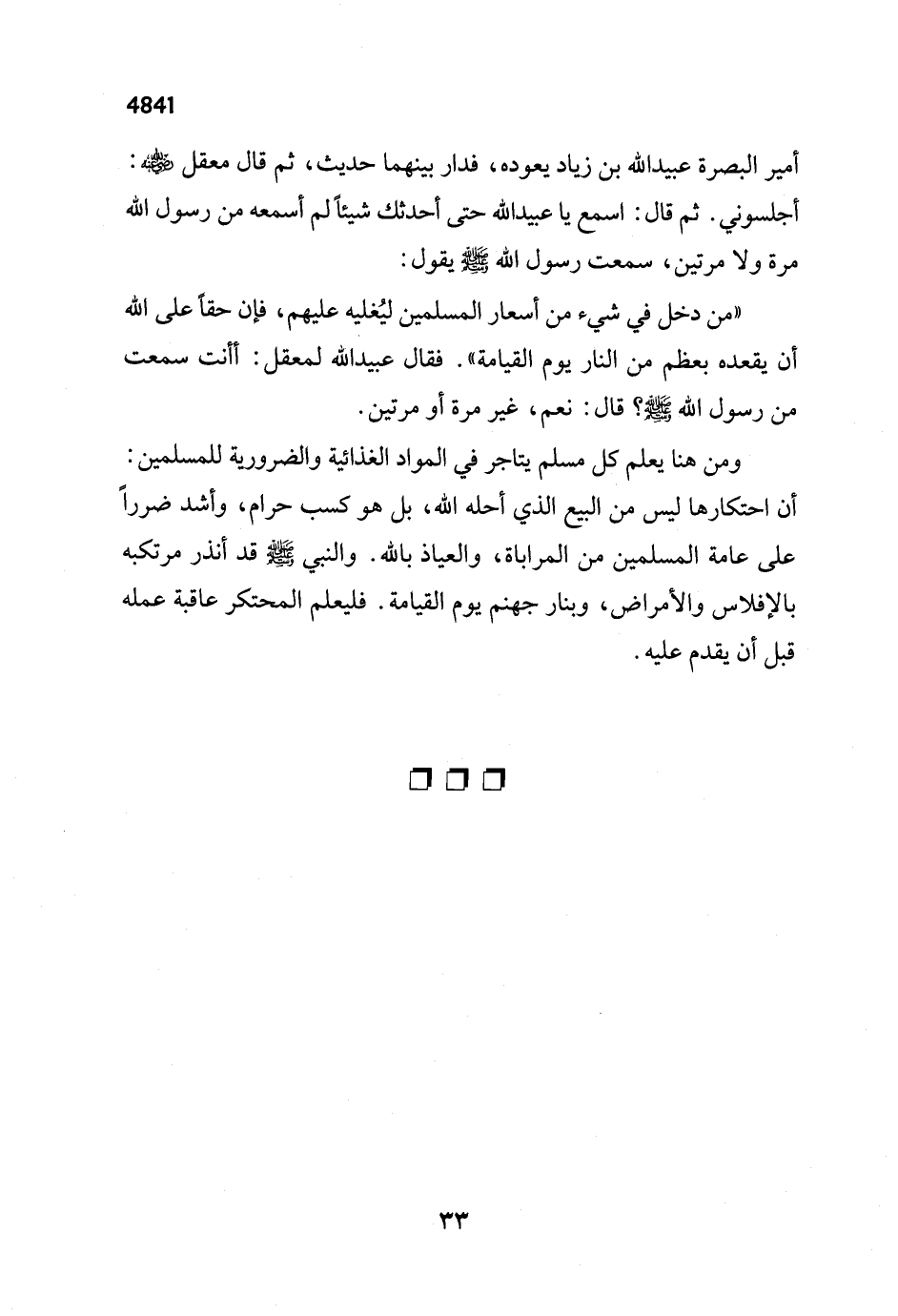 "من دخل في شيء من أسعار المسلمين ليُغليه عليهم، فإن حقاً على الله أن يقعده بعظم من النار يوم القيامة". فقال عبيد الله لمعقل: أأنت سمعت من رسول الله - صلى الله عليه وسلم -؟ قال: نعم، غير مرة أو مرتين.