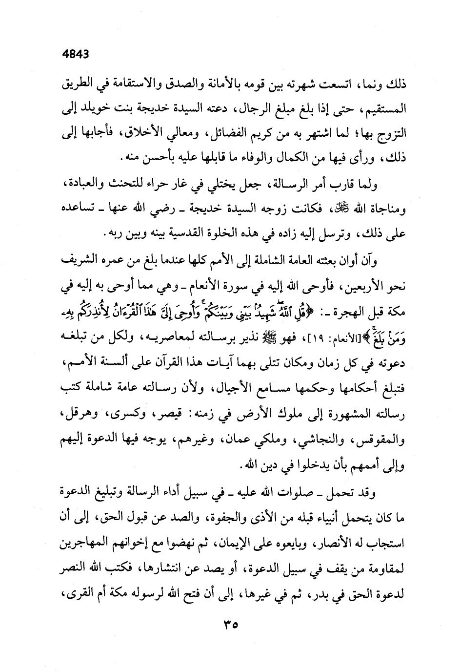 وآن أوان بعثته العامة الشاملة إلى الأمم كلها عندما بلغ من عمره الشريف نحو الأربعين، فأوحى الله إليه في سورة الأنعام -وهي مما أوحى به إليه في مكة قبل الهجرة-: {قُلِ اللَّهُ شَهِيدٌ بَيْنِي وَبَيْنَكُمْ وَأُوحِيَ إِلَيَّ هَذَا الْقُرْآنُ لِأُنْذِرَكُمْ بِهِ وَمَنْ بَلَغَ} الأنعام: 19] , فهو - صلى الله عليه وسلم - نذير برسالته لمعاصريه، ولكل من تبلغه دعوته في كل زمان ومكان تتلى بهما آيات هذا القرآن على ألسنة الأمم، فتبلغ أحكامها وحكمها مسامع الأجيال، ولأن رسالته عامة شاملة كتب رسالته المشهورة إلى ملوك الأرض في زمنه: قيصر، وكسرى، وهرقل، والمقوقس، والنجاشي، وملكي عمان، وغيرهم، يوجه فيها الدعوة إليهم وإلى أممهم بأن يدخلوا في دين الله.