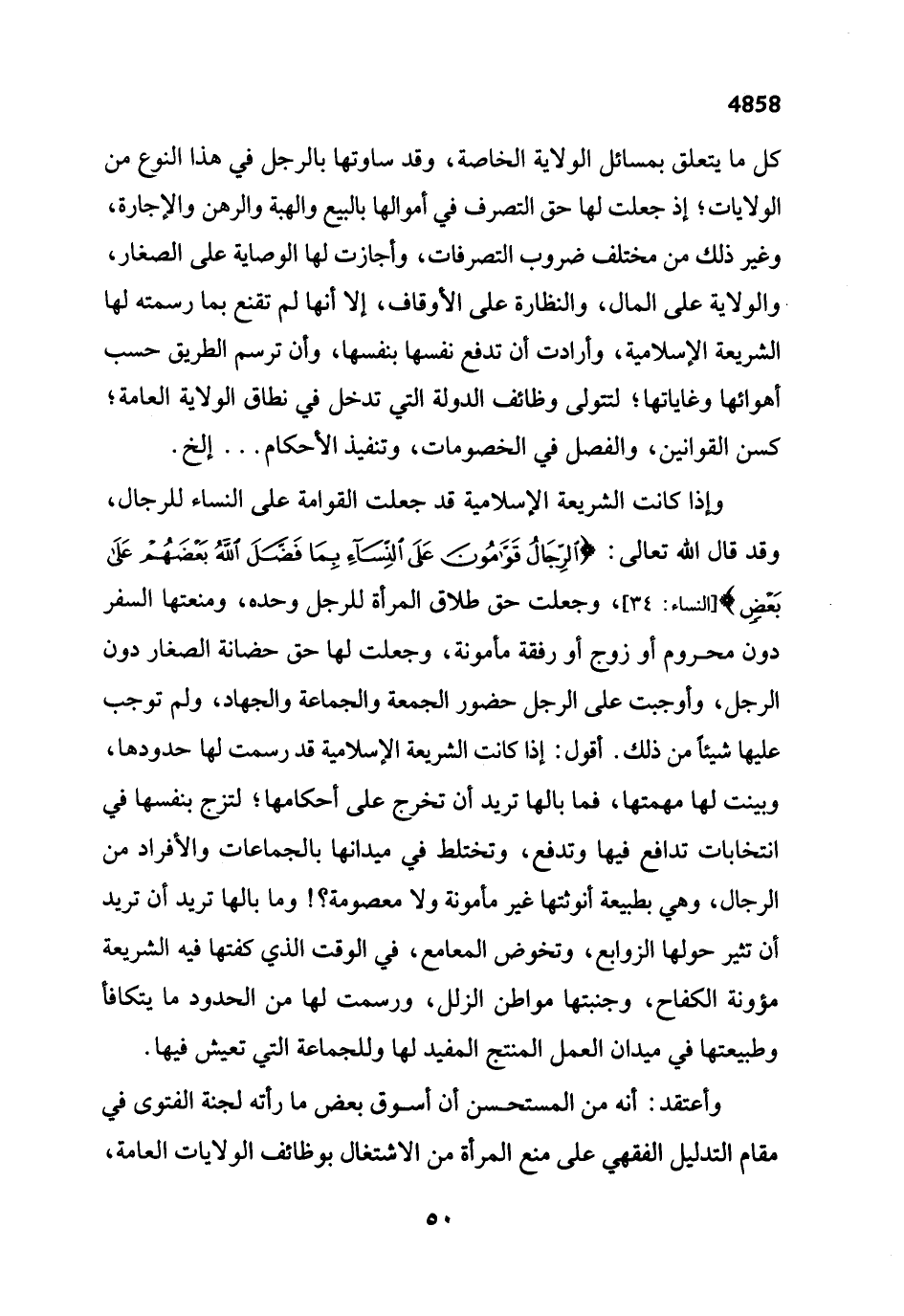 وإذا كانت الشريعة الإسلامية قد جعلت القوامة على النساء للرجال، وقد قال الله تعالى: {الرِّجَالُ قَوَّامُونَ عَلَى النِّسَاءِ بِمَا فَضَّلَ اللَّهُ بَعْضَهُمْ عَلَى بَعْضٍ} [النساء: 34]، وجعلت حق طلاق المرأة للرجل وحده، ومنعتها السفر دون محروم أو زوج أو رفقة مأمونة، وجعلت لها حق حضانة الصغار دون الرجل، وأوجبت على الرجل حضور الجمعة والجماعة والجهاد، ولم توجب عليها شيئاً من ذلك. أقول: إذا كانت الشريعة الإسلامية قد رسمت لها حدودها، وبينت لها مهمتها، فما بالها تريد أن تخرج على أحكامها؛ لتزج بنفسها في انتخابات تدافع فيها وتدفع، وتختلط في ميدانها بالجماعات والأفراد من الرجال، وهي بطبيعة أنوثتها غير مأمونة ولا معصومة؟! وما بالها تريد أن تريد أن تثير حولها الزوابع، وتخوض المعامع، في الوقت الذي كفتها فيه الشريعة مؤونة الكفاح، وجنبتها مواطن الزلل، ورسمت لها من الحدود ما يتكافأ وطبيعتها في ميدان العمل المنتج المفيد لها وللجماعة التي تعيش فيها.