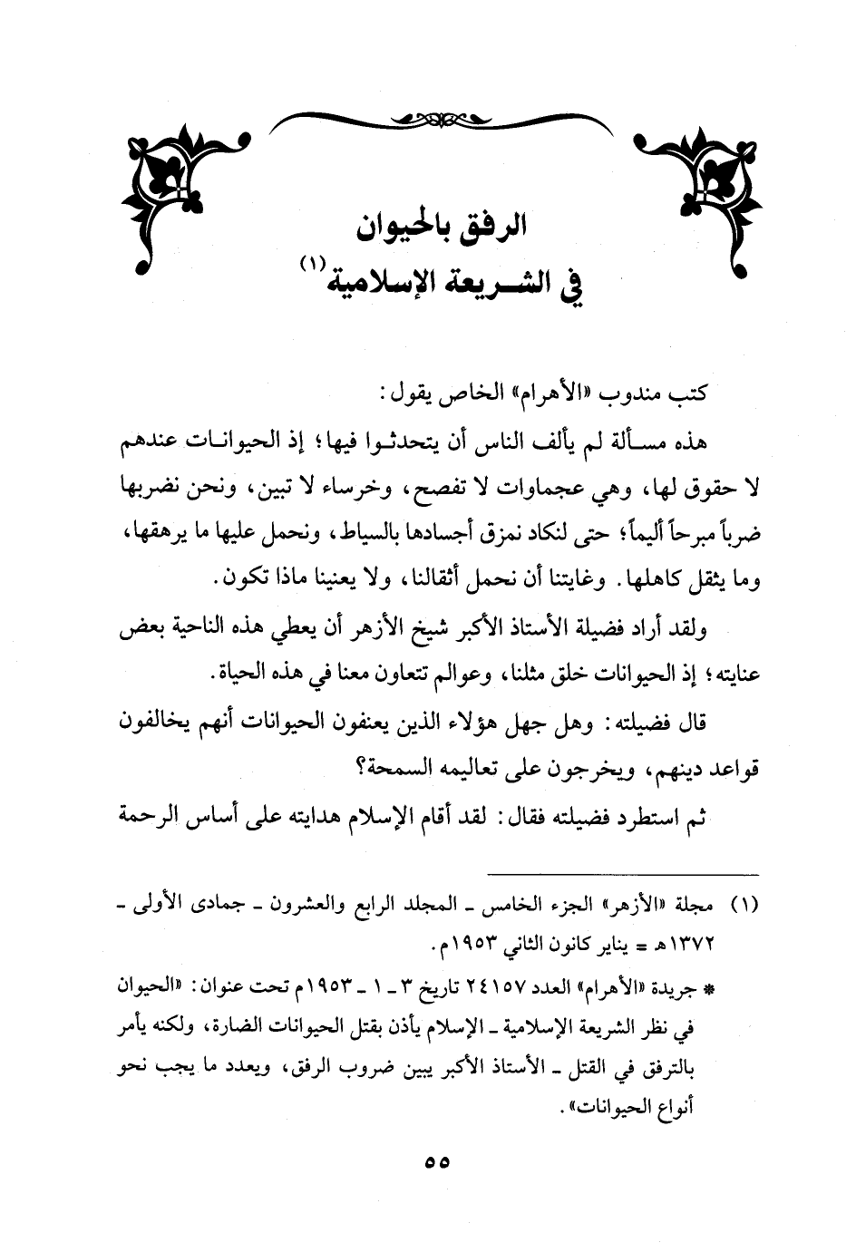 * جريدة "الأهرام" العدد 24157 تاريخ 3 - 1 - 1953 م تحت عنوان: "الحيوان في نظر الشريعة الإسلامية -الإسلام يأذن بقتل الحيوانات الضارة، ولكنه يأمر بالترفق في القتل- الأستاذ الأكبر يبين ضروب الرفق، ويعدد ما يجب نحو أنواع الحيوانات".