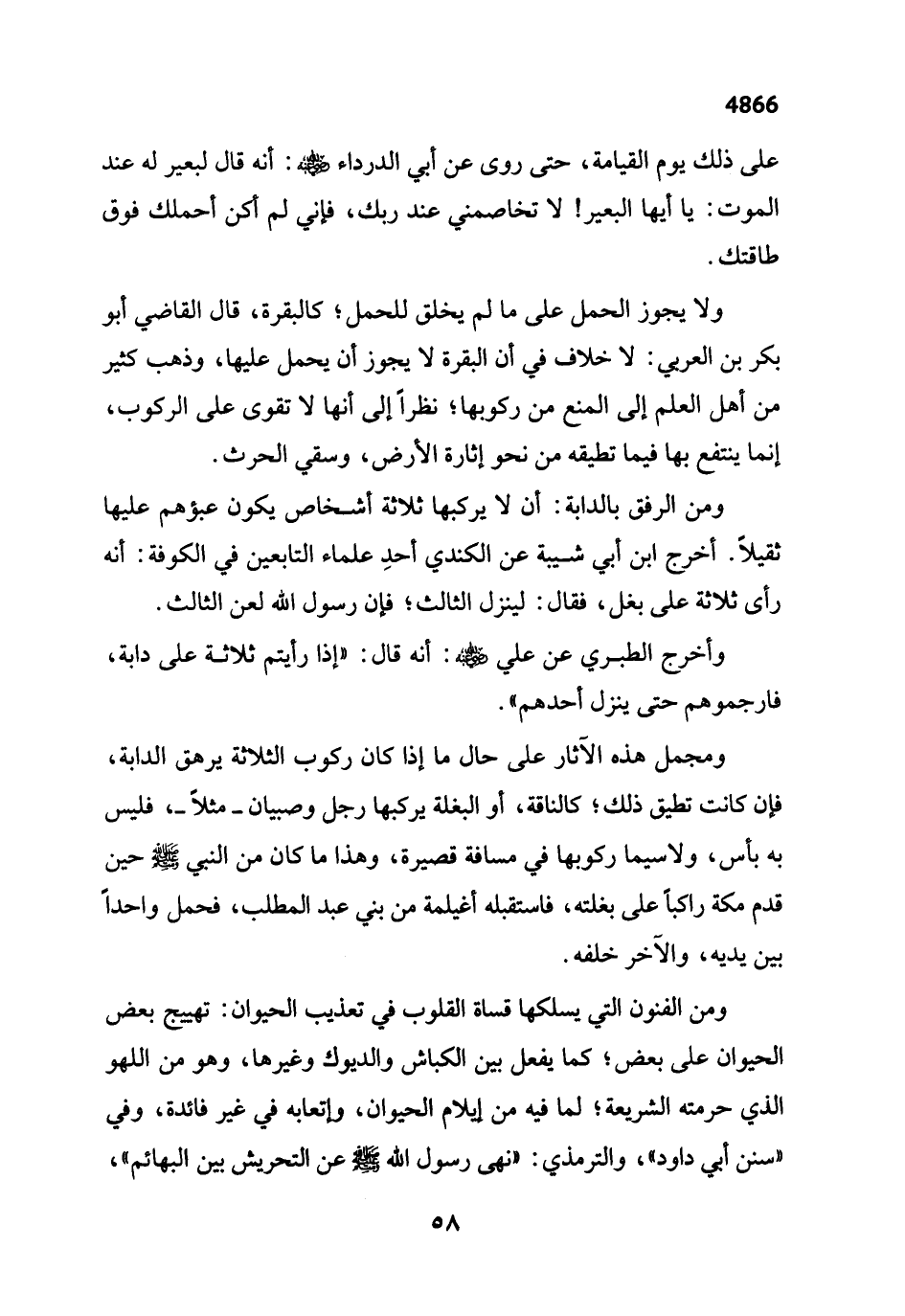 ومن الرفق بالدابة: أن لا يركبها ثلاثة أشخاص يكون عبؤهم عليها ثقيلاً. أخرج ابن أبي شيبة عن الكندي أحدِ علماء التابعين في الكوفة: أنه رأى ثلاثة على بغل، فقال: لينزل الثالث؛ فإن رسول الله لعن الثالث.