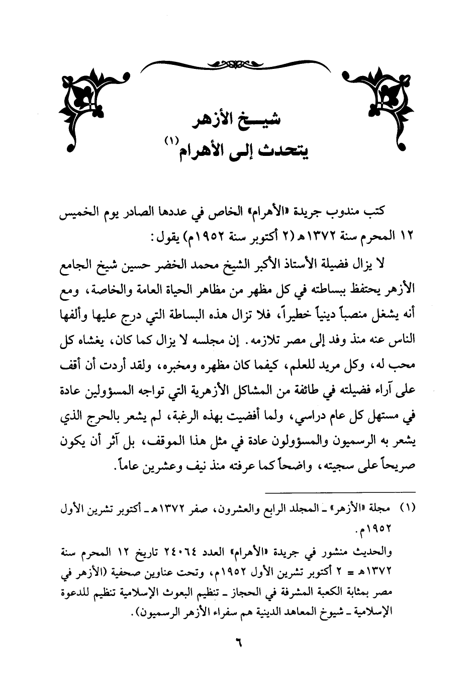لا يزال فضيلة الأستاذ الأكبر الشيخ محمد الخضر حسين شيخ الجامع الأزهر يحتفظ ببساطته في كل مظهر من مظاهر الحياة العامة والخاصة، ومع أنه يشغل منصباً دينياً خطيراً، فلا تزال هذه البساطة التي درج عليها وألفها الناس عنه منذ وفد إلى مصر تلازمه. إن مجلسه لا يزال كما كان، يغشاه كل محب له، وكل مريد للعلم، كيفما كان مظهره ومخبره، ولقد أردت أن أقف على آراء فضيلته في طائفة من المشاكل الأزهرية التي تواجه المسؤولين عادة في مستهل كل عام دراسي، ولما أفضيت بهذه الرغبة، لم يشعر بالحرج الذي يشعر به الرسميون والمسؤولون عادة في مثل هذا الموقف، بل آثر أن يكون صريحاً على سجيته، واضحاً كما عرفته منذ نيف وعشرين عاماً.