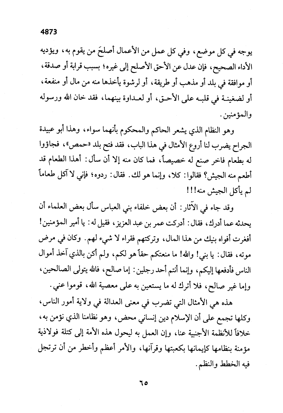 هذه هي الأمثال التي تضرب في معنى العدالة في ولاية أمور الناس، وكلها تجمع على أن الإسلام دين إنساني محض، وهو نظامنا الذي نؤمن به، خلافاً للأنظمة الأجنبية عنا، وإن العمل به ليحول هذه الأمة إلى كتلة فولاذية مؤمنة بنظامها كإيمانها بكعبتها وقرآنها، والأمر أعظم وأخطر من أن ترتجل فيه الخطط والنظم.