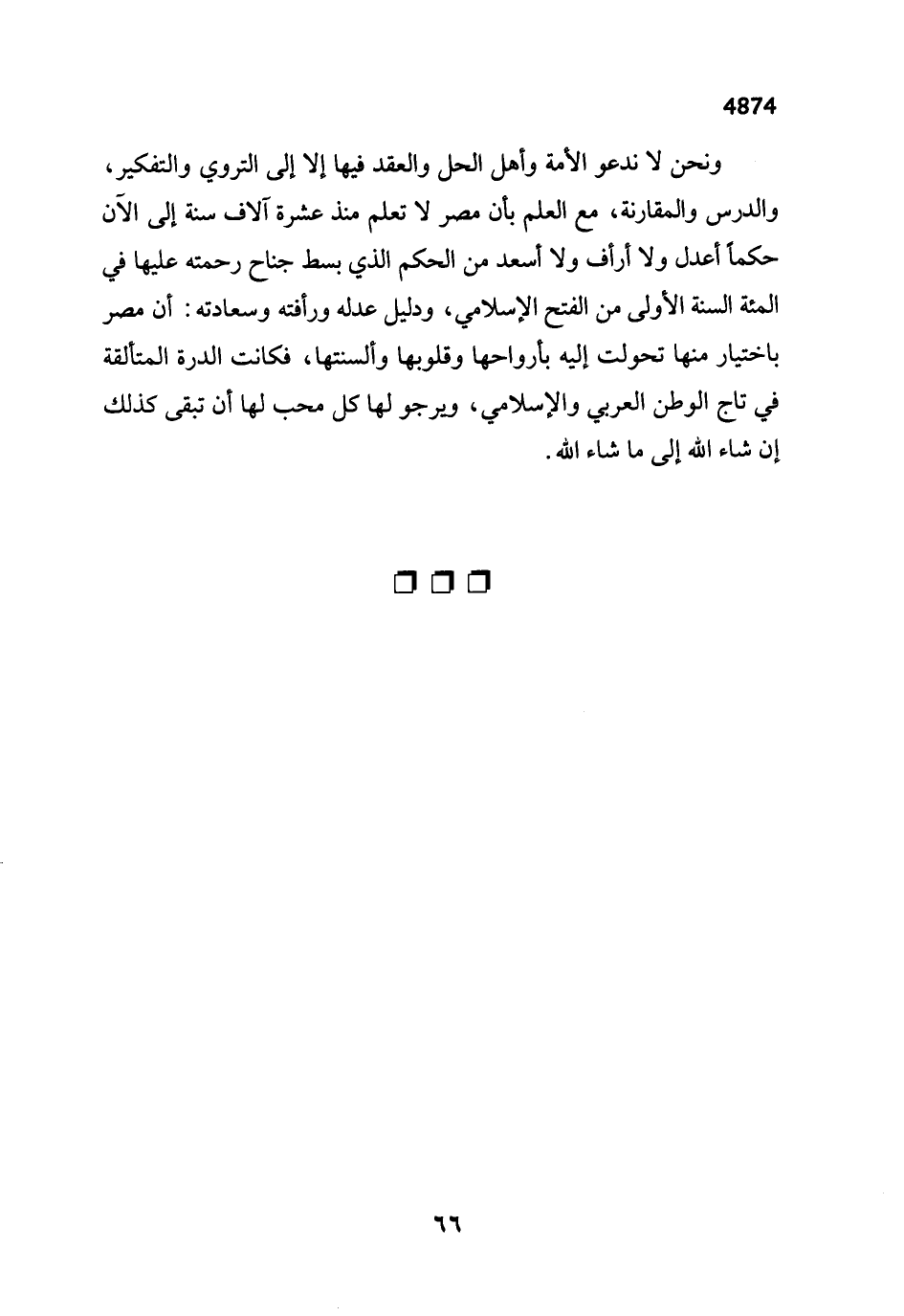 ونحن لا ندعو الأمة وأهل الحل والعقد فيها إلا إلى التروي والتفكير، والدرس والمقارنة، مع العلم بأن مصر لا تعلم منذ عشرة آلاف سنة إلى الآن حكماً أعدل ولا أرأف ولا أسعد من الحكم الذي بسط جناح رحمته عليها في المئة السنّة الأولى من الفتح الإسلامي، ودليل عدله ورأفته وسعادته: أن مصر باختيار منها تحولت إليه بأرواحها وقلوبها وألسنتها، فكانت الدرة المتألقة في تاج الوطن العربي والإسلامي، ويرجو لها كل محب لها أن تبقى كذلك إن شاء الله إلى ما شاء الله.