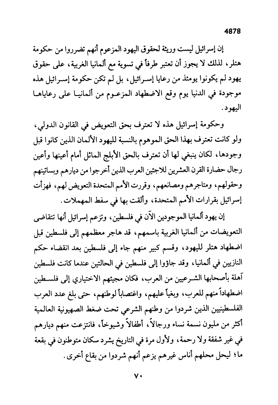 إن يهود ألمانيا الموجودين الآن في فلسطين، وتزعم إسرائيل أنها تتقاضى التعويضات من ألمانيا الغربية باسمهم، قد هاجر معظمهم إلى فلسطين قبل اضطهاد هتلر لليهود، وقسم كبير منهم جاء إلى فلسطين بعد انقضاء حكم النازيين في ألمانيا، وقد جاؤوا إلى فلسطين في الحالتين عندما كانت فلسطين آهلة بأصحابها الشرعيين من العرب، فكان مجيئهم الاختياري إلى فلسطين اضطهاداً منهم للعرب، ويغياً عليهم، واغتصاباً لوطنهم، حتى بلغ عدد العرب الفلسطينيين الذين شردوا من وطنهم الشرعي تحت ضغط الصهيونية العالمية أكثر من مليون نسمة نساء ورجالاً، أطفالاً وشيوخاً، فانتزعت منهم ديارهم في غير شفقة ولا رحمة، ولأول مرة في التاريخ يشرد سكان متوطنون في بقعة ما؛ ليحل محلهم أناس غيرهم يزعم أنهم شردوا من بقاع أخرى.