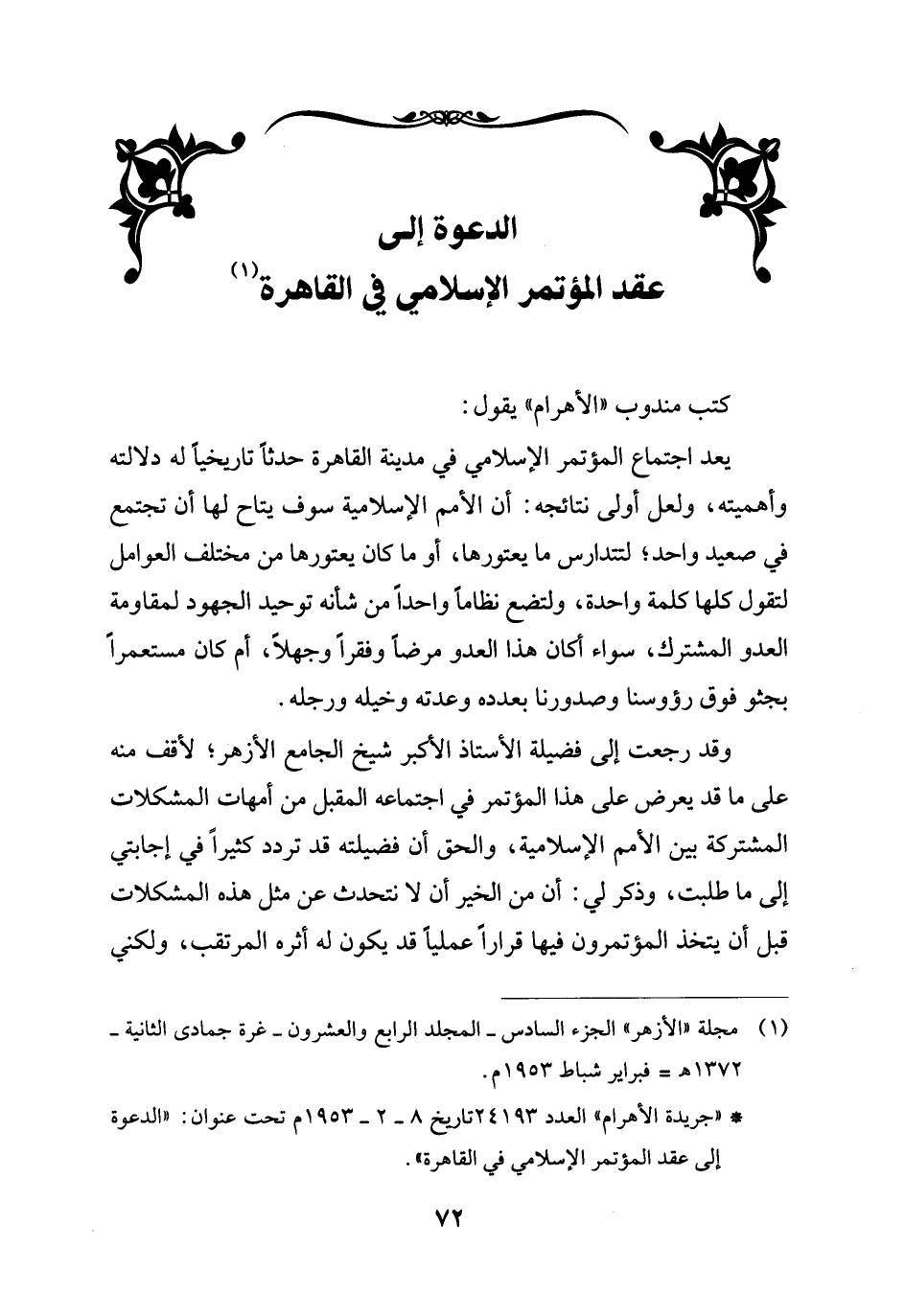 * "جريدة الأهرام" العدد 24193 تاريخ 8 - 2 - 1953 م تحت عنوان: "الدعوة إلى عقد المؤتمر الإسلامي في القاهرة".