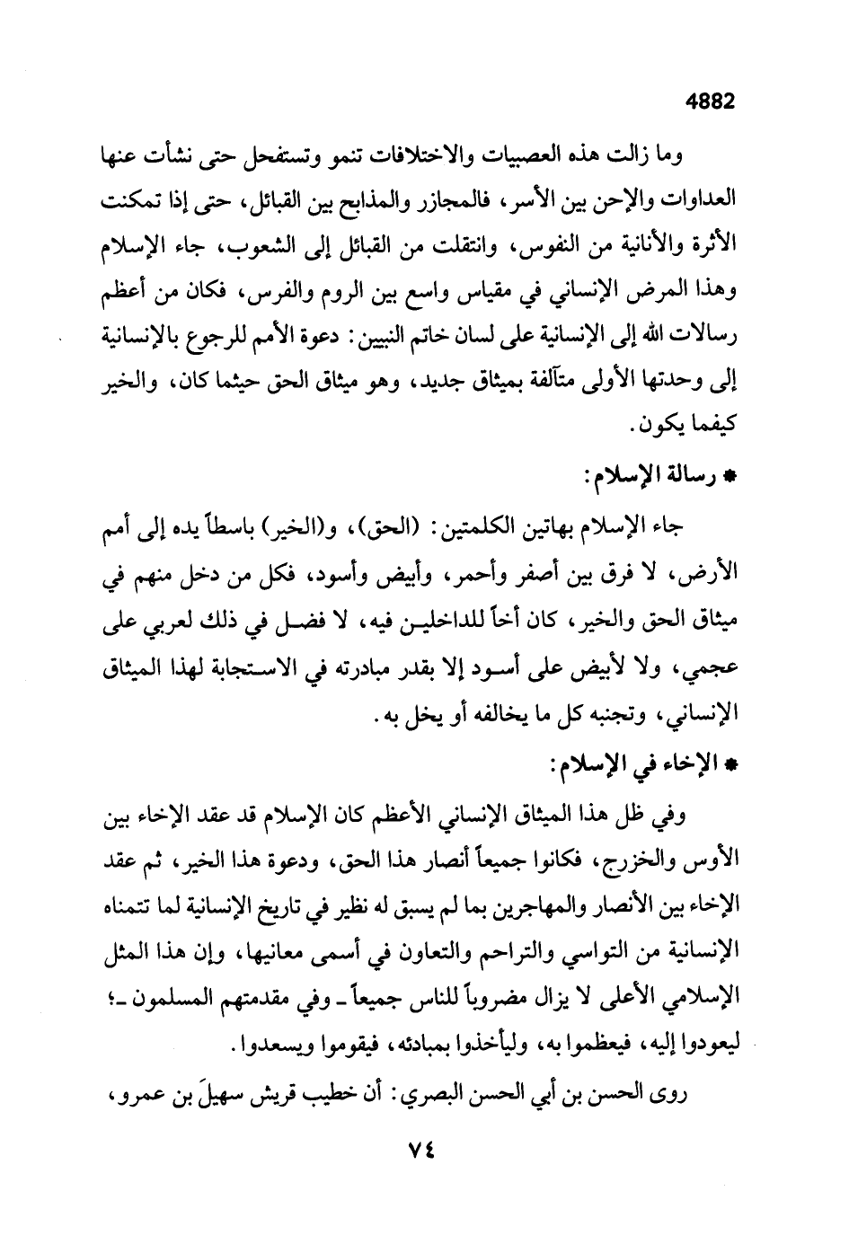 وما زالت هذه العصبيات والاختلافات تنمو وتستفحل حتى نشأت عنها العداوات والإحن بين الأسر، فالمجازر والمذابح بين القبائل، حتى إذا تمكنت الأثرة والأنانية من النفوس، وانتقلت من القبائل إلى الشعوب، جاء الإسلام وهذا المرض الإنساني في مقياس واسع بين الروم والفرس، فكان من أعظم رسالات الله إلى الإنسانية على لسان خاتم النبيين: دعوة الأمم للرجوع بالإنسانية إلى وحدتها الأولى متآلفة بميثاق جديد، وهو ميثاق الحق حيثما كان، والخير كيفما يكون.