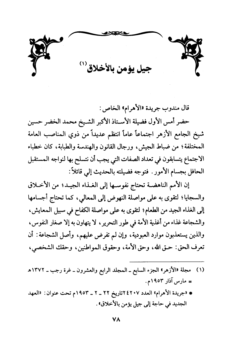 * "جريدة الأهرام" العدد 24207 تاريخ 22 - 2 - 1953 م تحت عنوان: "العهد الجديد في حاجة إلى جيل يؤمن بالأخلاق".
