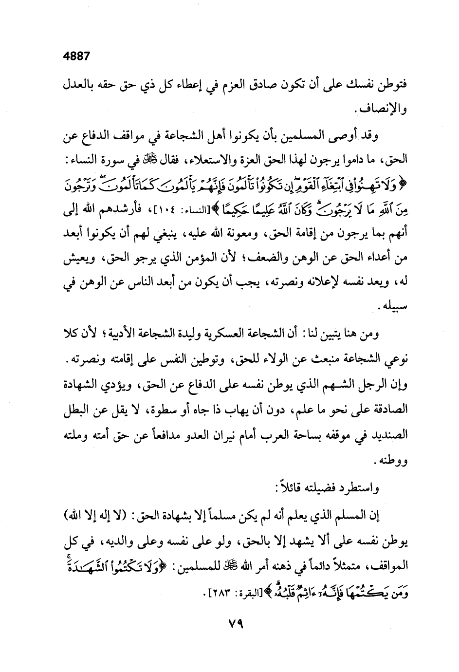 ومن هنا يتبين لنا: أن الشجاعة العسكرية وليدة الشجاعة الأدبية؛ لأن كلا نوعي الشجاعة منبعث عن الولاء للحق، وتوطين النفس على إقامته ونصرته. وإن الرجل الشهم الذي يوطن نفسه على الدفاع عن الحق، ويؤدي الشهادة الصادقة على نحو ما علم، دون أن يهاب ذا جاه أو سطوة، لا يقل عن البطل الصنديد في موقفه بساحة العرب أمام نيران العدو مدافعاً عن حق أمته وملته ووطنه.