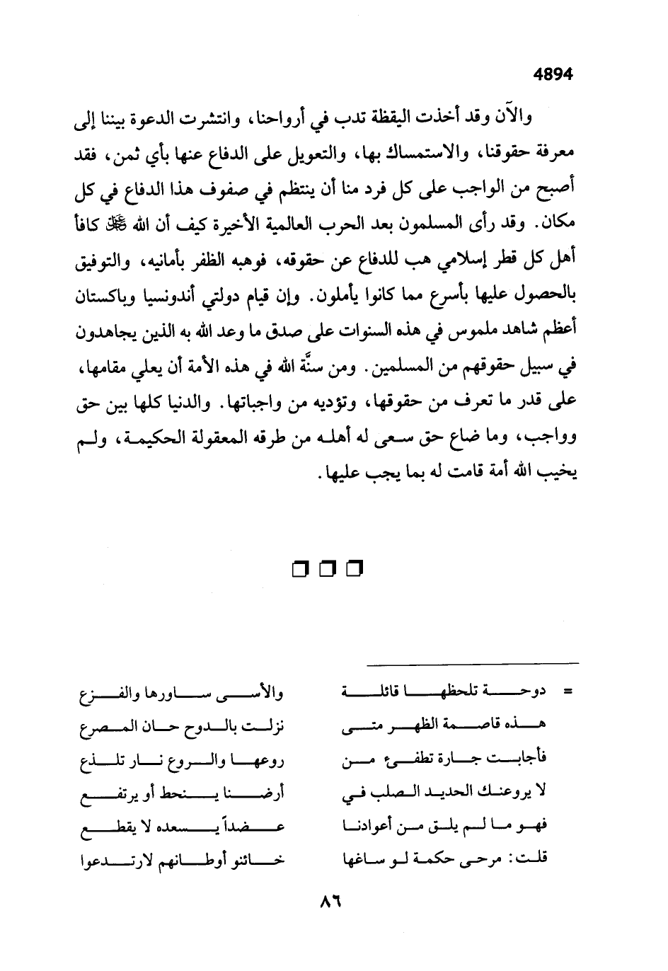 والآن وقد أخذت اليقظة تدب في أرواحنا، وانتشرت الدعوة بيننا إلى معرفة حقوقنا، والاستمساك بها، والتعويل على الدفاع عنها بأي ثمن، فقد أصبح من الواجب على كل فرد منا أن ينتظم في صفوف هذا الدفاع في كل مكان. وقد رأى المسلمون بعد الحرب العالمية الأخيرة كيف أن الله -عَزَّ وَجَلَّ- كافأ أهل كل قطر إسلامي هب للدفاع عن حقوقه، فوهبه الظفر بأمانيه، والتوفيق بالحصول عليها بأسرع مما كانوا يأملون. وإن قيام دولتي أندونسيا وباكستان أعظم شاهد ملموس في هذه السنوات على صدق ما وعد الله به الذين يجاهدون في سبيل حقوقهم من المسلمين. ومن سنَّة الله في هذه الأمة أن يعلي مقامها، على قدر ما تعرف من حقوقها، وتؤديه من واجباتها. والدنيا كلها بين حق وواجب، وما ضاع حق سعى له أهله من طرقه المعقولة الحكيمة، ولم يخيب الله أمة قامت له بما يجب عليها.
