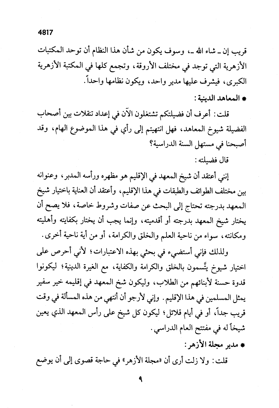 قريب إن -شاء الله-، وسوف يكون من شأن هذا النظام أن توحد المكتبات الأزهرية التي توجد في مختلف الأروقة، وتجمع كلها في المكتبة الأزهرية الكبرى، فيشرف عليها مدير واحد، ويكون نظامها واحداً.