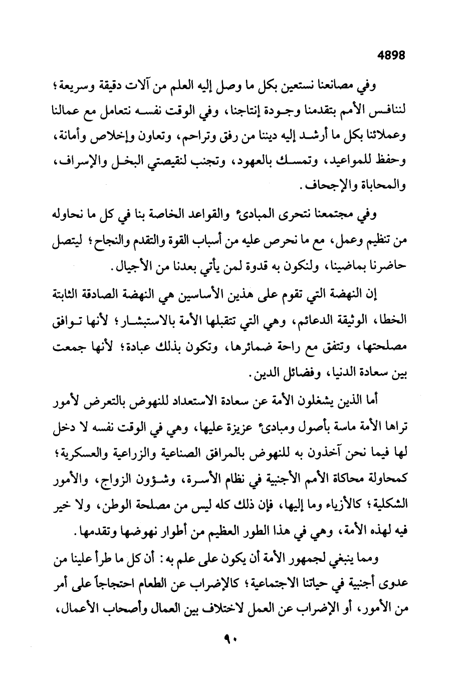 وفي مصانعنا نستعين بكل ما وصل إليه العلم من آلات دقيقة وسريعة؛ لننافس الأمم بتقدمنا وجودة إنتاجنا، وفي الوقت نفسه نتعامل مع عمالنا وعملائنا بكل ما أرشد إليه ديننا من رفق وتراحم، وتعاون وإخلاص وأمانة، وحفظ للمواعيد، وتمسك بالعهود، وتجنب لنقيصتي البخل والإسراف، والمحاباة والإجحاف.