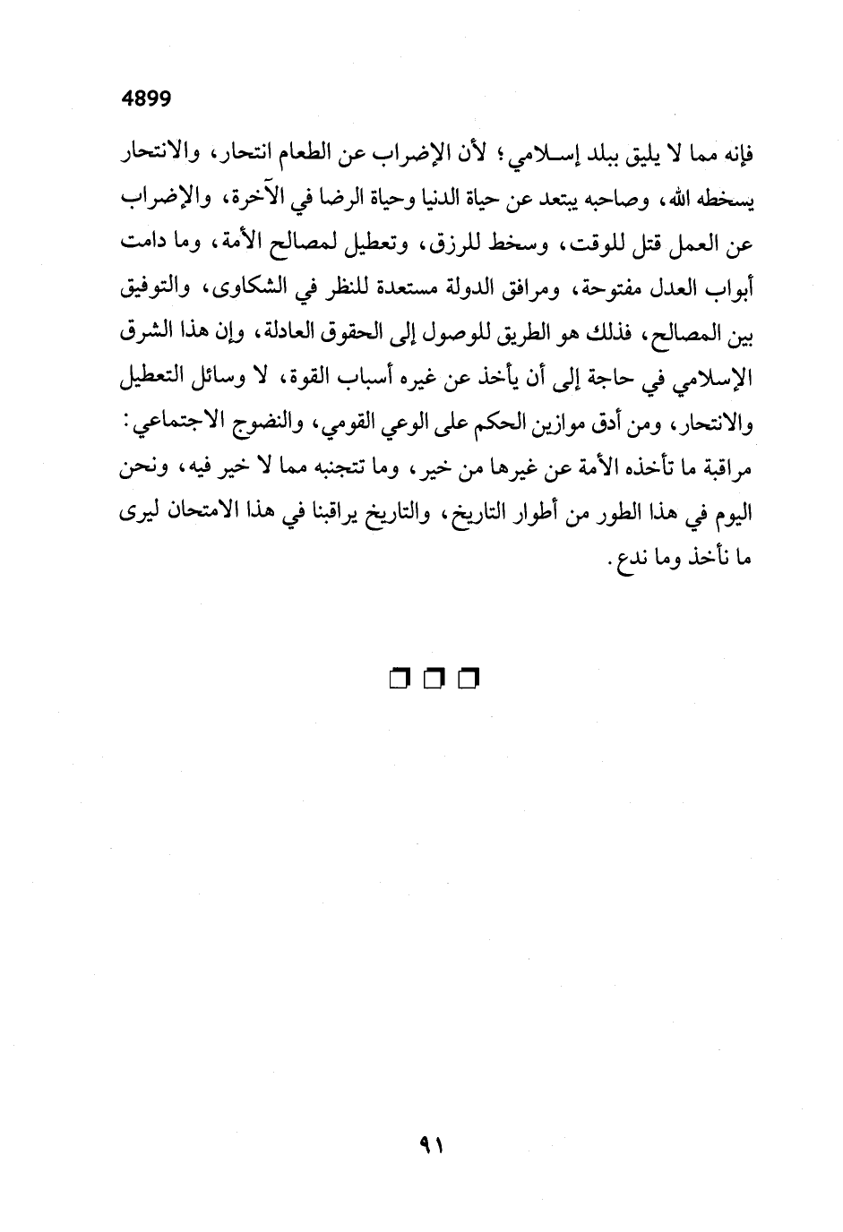 فإنه مما لا يليق ببلد إسلامي؛ لأن الإضراب عن الطعام انتحار، والانتحار يسخطه الله، وصاحبه يبتعد عن حياة الدنيا وحياة الرضا في الآخرة، والإضراب عن العمل قتل للوقت، وسخط للرزق، وتعطيل لمصالح الأمة، وما دامت أبواب العدل مفتوحة، ومرافق الدولة مستعدة للنظر في الشكاوى، والتوفيق بين المصالح، فذلك هو الطريق للوصول إلى الحقوق العادلة، وإن هذا الشرق الإسلامي في حاجة إلى أن يأخذ عن غيره أسباب القوة، لا وسائل التعطيل والانتحار، ومن أدق موازين الحكم على الوعي القومي، والنضوج الاجتماعي: مراقبة ما تأخذه الأمة عن غيرها من خير، وما تتجنبه مما لا خير فيه، ونحن اليوم في هذا الطور من أطوار التاريخ، والتاريخ يراقبنا في هذا الامتحان ليرى ما نأخذ وما ندع.