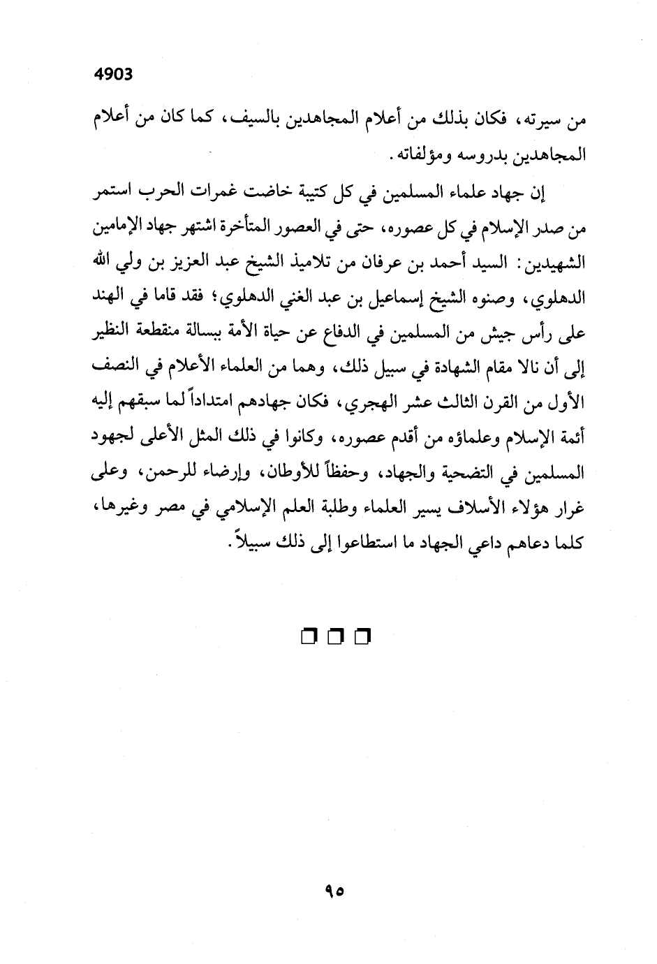 إن جهاد علماء المسلمين في كل كتيبة خاضت غمرات الحرب استمر من صدر الإسلام في كل عصوره، حتى في العصور المتأخرة اشتهر جهاد الإمامين الشهيدين: السيد أحمد بن عرفان من تلاميذ الشيخ عبد العزيز بن ولي الله الدهلوي، وصنوه الشيخ إسماعيل بن عبد الغني الدهلوي؛ فقد قاما في الهند على رأس جيش من المسلمين في الدفاع عن حياة الأمة ببسالة منقطعة النظير إلى أن نالا مقام الشهادة في سبيل ذلك، وهما من العلماء الأعلام في النصف الأول من القرن الثالث عشر الهجري، فكان جهادهم امتداداً لما سبقهم إليه أئمة الإسلام وعلماؤه من أقدم عصوره، وكانوا في ذلك المثل الأعلى لجهود المسلمين في التضحية والجهاد، وحفظاً للأوطان، وإرضاء للرحمن، وعلى غرار هؤلاء الأسلاف يسير العلماء وطلبة العلم الإسلامي في مصر وغيرها، كلما دعاهم داعي الجهاد ما استطاعوا إلى ذلك سبيلاً.