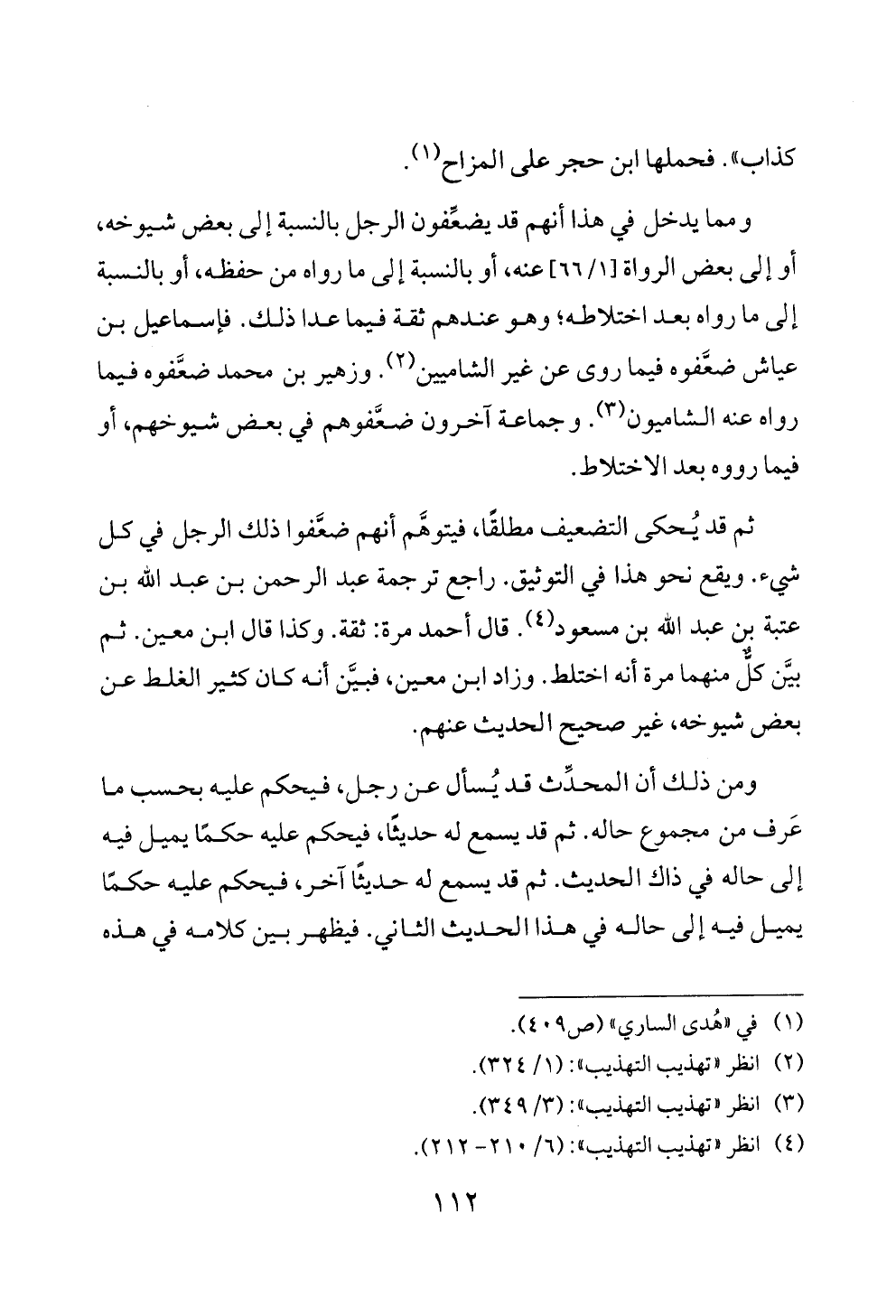 ثم قد يُحكى التضعيف مطلقًا، فيتوهَّم أنهم ضعَّفوا ذلك الرجل في كل شيء. ويقع نحو هذا في التوثيق. راجع ترجمة عبد الرحمن بن عبد الله بن عتبة بن عبد الله بن مسعود (¬٤). قال أحمد مرة: ثقة. وكذا قال ابن معين. ثم بيَّن كلٌّ منهما مرة أنه اختلط. وزاد ابن معين، فبيَّن أنه كان كثير الغلط عن بعض شيوخه، غير صحيح الحديث عنهم.