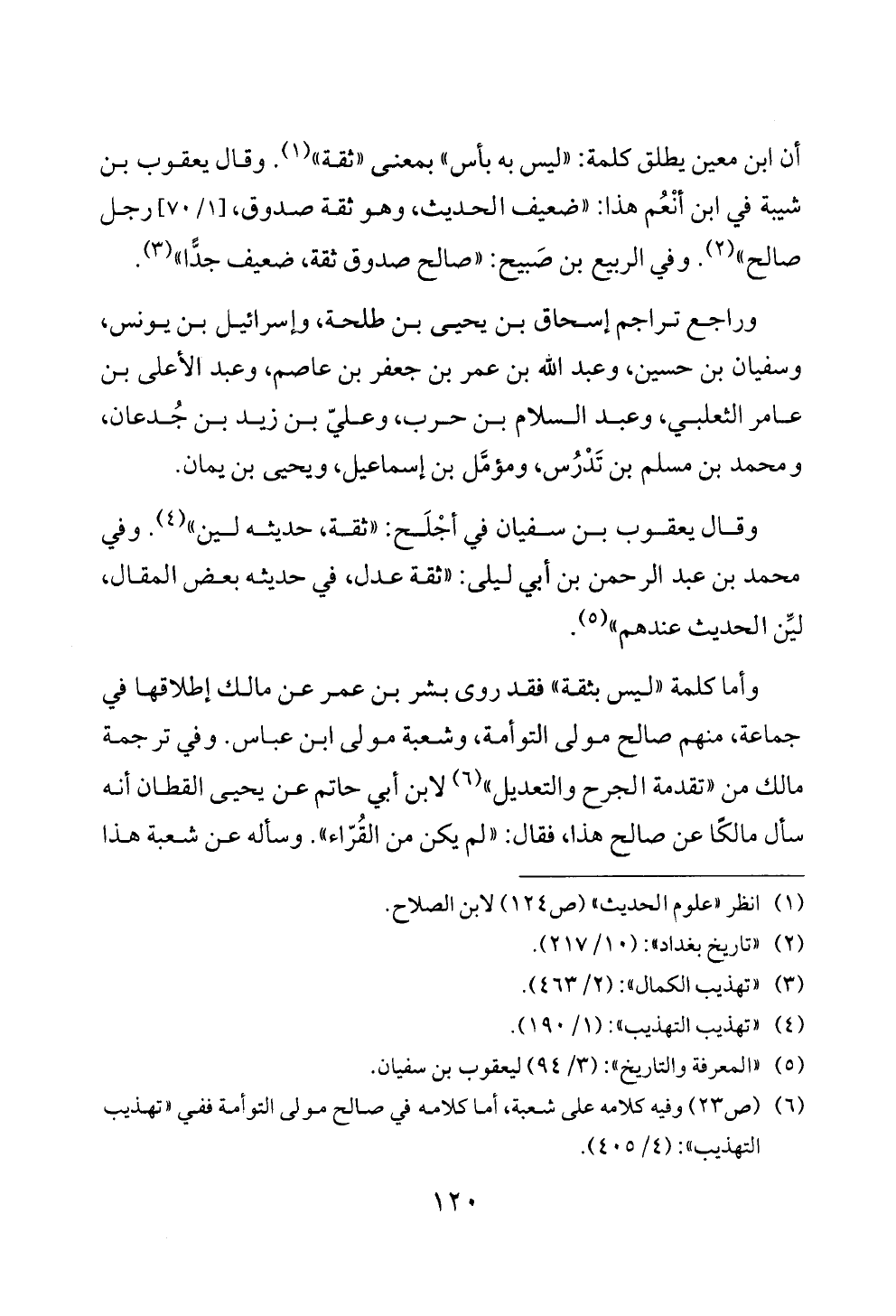 أن ابن معين يطلق كلمة: "ليس به بأس" بمعنى "ثقة" (¬١). وقال يعقوب بن شيبة في ابن أنْعُم هذا: "ضعيف الحديث، وهو ثقة صدوق، [١/ ٧٠] رجل صالح" (¬٢). وفي الربيع بن صَبيح: "صالح صدوق ثقة، ضعيف جدًّا" (¬٣).