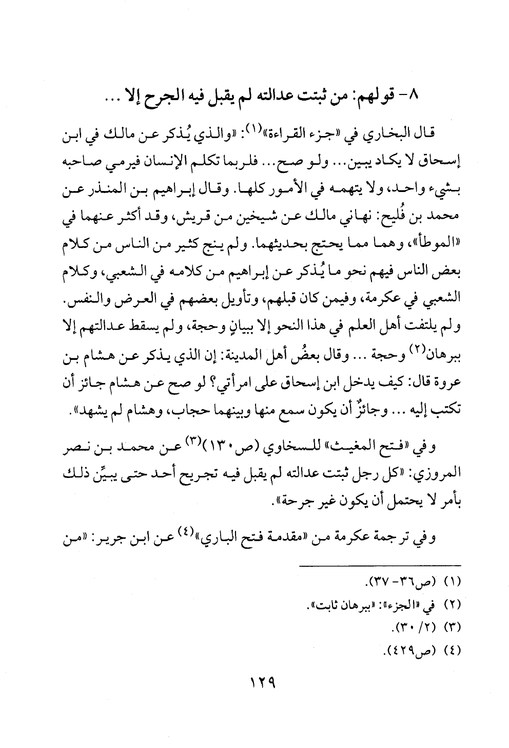 وفي "فتح المغيث" للسخاوي (ص ١٣٠) (¬٣) عن محمد بن نصر المروزي: "كل رجل ثبتت عدالته لم يقبل فيه تجريح أحد حتى يبيِّن ذلك بأمر لا يحتمل أن يكون غير جرحة".