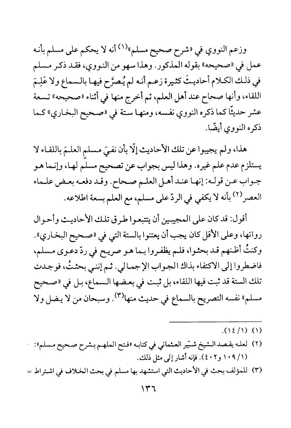 هذا، ولم يجيبوا عن تلك الأحاديث إلّا بأن نفيَ مسلمٍ العلمَ باللقاء لا يستلزم عدم علم غيره. وهذا ليس بجواب عن تصحيح مسلم لها، وإنما هو جواب عن قوله: إنها عند أهل العلم صحاح. وقد دفعه بعض علماء العصر (¬٢) بأنه لا يكفي في الردّ على مسلم، مع العلم بسعة اطلاعه.