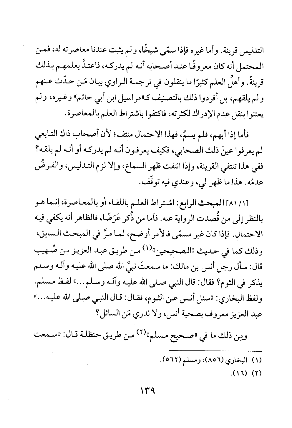 [١/ ٨١] المبحث الرابع: اشتراط العلم باللقاء أو بالمعاصرة، إنما هو بالنظر إلى من قُصدت الرواية عنه. فأما من ذُكر عَرَضًا، فالظاهر أنه يكفي فيه الاحتمال. فإذا كان غير مسمّى فالأمر أوضح، لما مرَّ في المبحث السابق، وذلك كما في حديث "الصحيحين" (¬١) من طريق عبد العزيز بن صُهيب قال: سأل رجل أنس بن مالك: ما سمعتَ نبيَّ الله صلى الله عليه وآله وسلم يذكر في الثوم؟ فقال: قال النبي صلى الله عليه وآله وسلم ... " لفظ مسلم. ولفظ البخاري: "سئل أنس عن الثوم، فقال: قال النبي صلى الله عليه ... " عبد العزيز معروف بصحبة أنس، ولا ندري مَن السائل؟