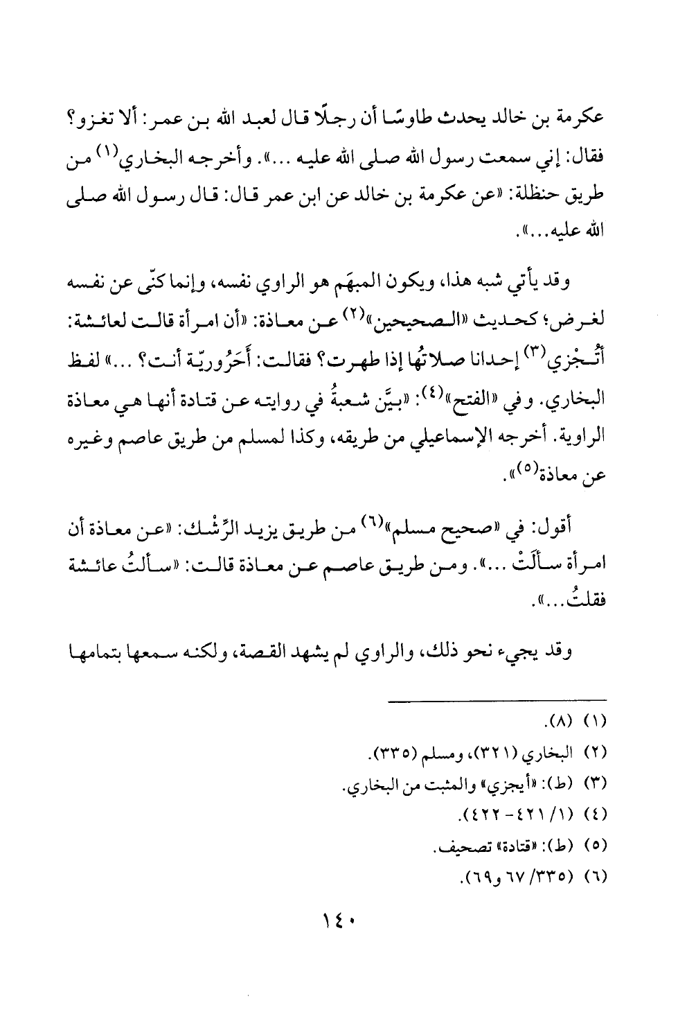 وقد يأتي شبه هذا، ويكون المبهَم هو الراوي نفسه، وإنما كنّى عن نفسه لغرض؛ كحديث "الصحيحين" (¬٢) عن معاذة: "أن امرأة قالت لعائشة: أتُجْزي (¬٣) إحدانا صلاتُها إذا طهرت؟ فقالت: أَحَرُوريّة أنت؟ ... " لفظ البخاري. وفي "الفتح" (¬٤): "بيَّن شعبةُ في روايته عن قتادة أنها هي معاذة الراوية. أخرجه الإسماعيلي من طريقه، وكذا لمسلم من طريق عاصم وغيره عن معاذة (¬٥) ".