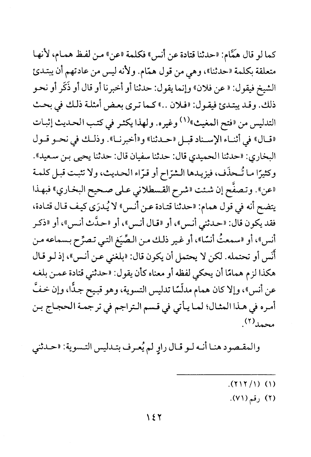 كما لو قال هَمَّام: "حدثنا قتادة عن أنس" فكلمة "عن" من لفظ همام، لأنها متعلقة بكلمة "حدثنا"، وهي من قول همّام. ولأنه ليس من عادتهم أن يبتدئ الشيخ فيقول: " عن فلان" وإنما يقول: حدثنا أو أخبرنا أو قال أو ذَكَر أو نحو ذلك. وقد يبتدئ فيقول: "فلان .. " كما ترى بعض أمثلة ذلك في بحث التدليس من "فتح المغيث" (¬١) وغيره. ولهذا يكثر في كتب الحديث إثبات "قال" في أثناء الإسناد قبل "حدثنا" و"أخبرنا". وذلك في نحو قول البخاري: "حدثنا الحميدي قال: حدثنا سفيان قال: حدثنا يحيى بن سعيد". وكثيرًا ما تُحذَف، فيزيدها الشرّاح أو قرّاء الحديث، ولا تثبت قبل كلمة "عن". وتصفَّح إن شئت "شرح القسطلاني على صحيح البخاري" فبهذا يتضح أنه في قول همام: "حدثنا قتادة عن أنس" لا يُدرَى كيف قال قتادة، فقد يكون قال: "حدثني أنس"، أو "قال أنس"، أو "حدَّث أنس"، أو "ذكر أنس"، أو "سمعتُ أنسًا"، أو غير ذلك من الصِّيَغ التي تصرِّح بسماعه من أَنَس أو تحتمله. لكن لا يحتمل أن يكون قال: "بلغني عن أنس"، إذ لو قال هكذا لزم همامًا أن يحكي لفظه أو معناه كأن يقول: "حدثني قتادة عمن بلغه عن أنس"، وإلا كان همام مدلّسًا تدليس التسوية، وهو قبيح جدًّا، وإن خفَّ أمره في هذا المثال؛ لما يأتي في قسم التراجم في ترجمة الحجاج بن محمد (¬٢).