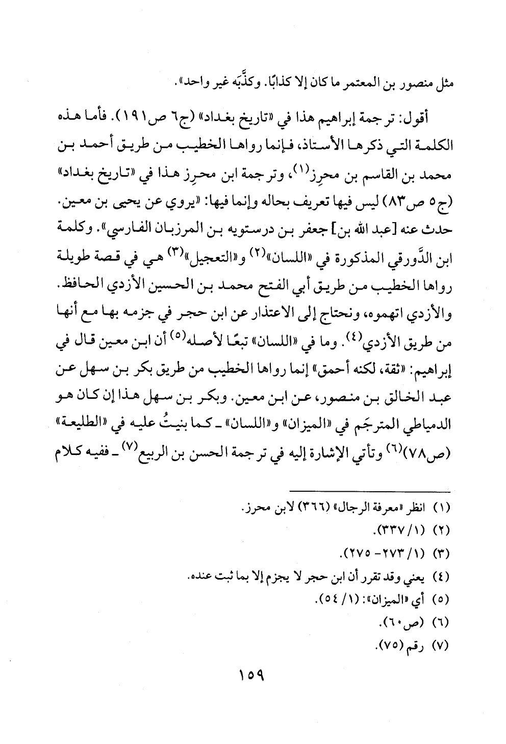 أقول: ترجمة إبراهيم هذا في «تاريخ بغداد» (ج ٦ ص ١٩١). فأما هذه الكلمة التي ذكرها الأستاذ، فإنما رواها الخطيب من طريق أحمد بن محمد بن القاسم بن محرِز (¬١)، وترجمة ابن محرِز هذا في «تاريخ بغداد» (ج ٥ ص ٨٣) ليس فيها تعريف بحاله وإنما فيها: «يروي عن يحيى بن معين. حدث عنه [عبد الله بن] جعفر بن درستويه بن المرزبان الفارسي». وكلمة ابن الدَّورقي المذكورة في «اللسان» (¬٢) و «التعجيل» (¬٣) هي في قصة طويلة رواها الخطيب من طريق أبي الفتح محمد بن الحسين الأزدي الحافظ. والأزدي اتهموه، ونحتاج إلى الاعتذار عن ابن حجر في جزمه بها مع أنها من طريق الأزدي (¬٤). وما في «اللسان» تبعًا لأصله (¬٥) أن ابن معين قال في إبراهيم: «ثقة، لكنه أحمق» إنما رواها الخطيب من طريق بكر بن سهل عن عبد الخالق بن منصور، عن ابن معين. وبكر بن سهل هذا إن كان هو الدمياطي المترجَم في «الميزان» و «اللسان» ــ كما بنيتُ عليه في «الطليعة» (ص ٧٨) (¬٦) وتأتي الإشارة إليه في ترجمة الحسن بن الربيع (¬٧) ــ ففيه كلام