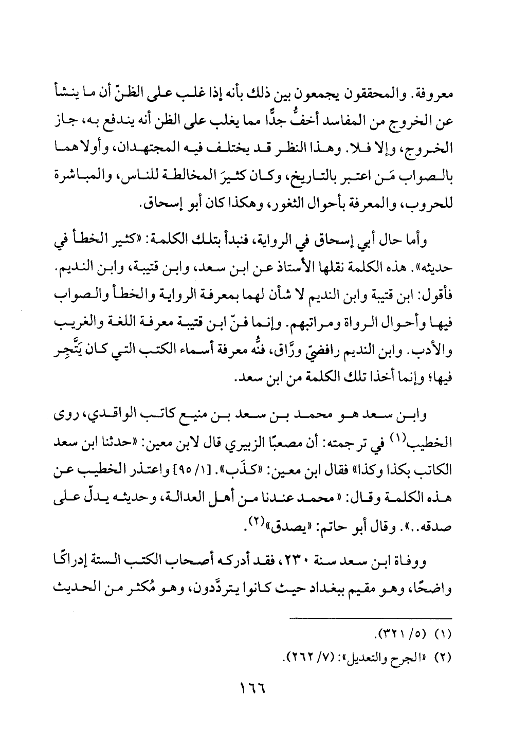 وأما حال أبي إسحاق في الرواية، فنبدأ بتلك الكلمة: «كثير الخطأ في حديثه». هذه الكلمة نقلها الأستاذ عن ابن سعد، وابن قتيبة، وابن النديم. فأقول: ابن قتيبة وابن النديم لا شأن لهما بمعرفة الرواية والخطأ والصواب فيها وأحوال الرواة ومراتبهم. وإنما فنّ ابن قتيبة معرفة اللغة والغريب والأدب. وابن النديم رافضيّ ورَّاق، فنُّه معرفة أسماء الكتب التي كان يَتَّجِر فيها؛ وإنما أخذا تلك الكلمة من ابن سعد.
